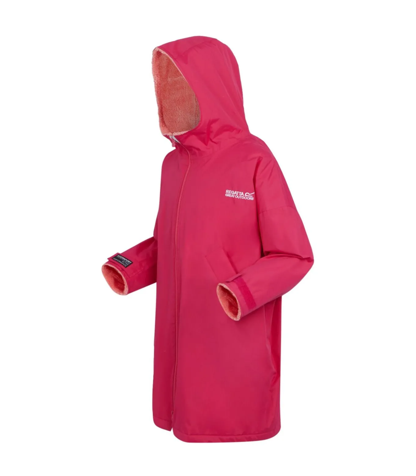 Deze omkleedjas van Regatta is gemaakt van 100% polyester met een borg fleece voering. De gebruikte stof is Hydrafort 5000, die is afgewerkt met een duurzame waterafstotende coating om warmte, waterdichtheid en winddichtheid te bieden. De achterkant van de badjas is voorzien van verschillende prints, cirkels en logo’s. Verstelbare polsbandjes zorgen voor een goede pasvorm rond de manchetten. De halslijn met capuchon is voorzien van een meegroeibare capuchon voor bedekking. Lange mouwen bieden volledige bedekking voor de armen. De naden zijn getapet om de waterdichtheid te versterken. De oversized pasvorm maakt layering gemakkelijk. Opbergmogelijkheden zijn onder andere twee zakken met rits aan de onderkant, een binnenzak en een hoofdrits over de hele lengte. De badjas is geproduceerd met gerecyclede materialen, ter ondersteuning van duurzaamheid.