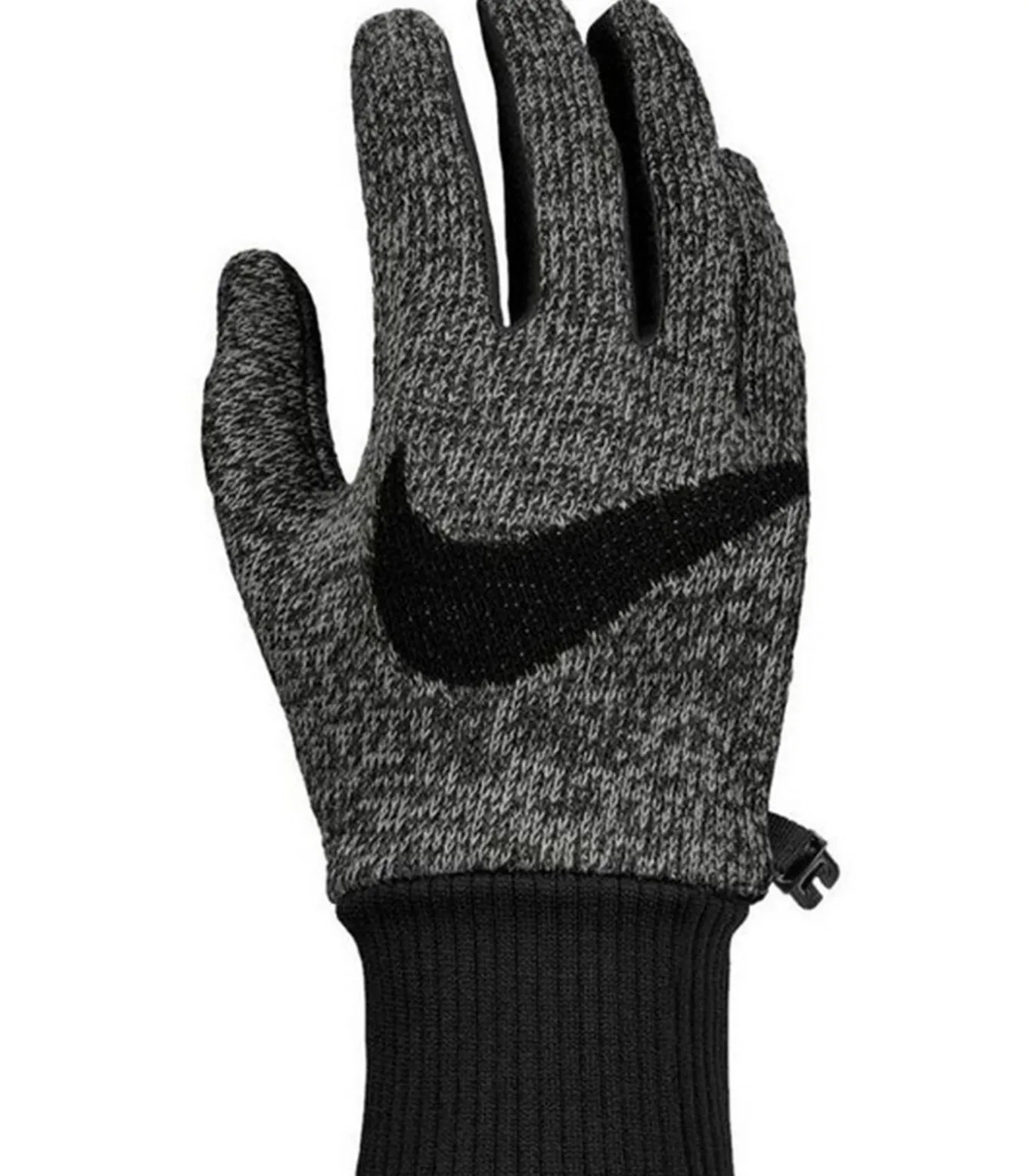 Nike–merk handschoenen met grijs logo, met flexibele en stoftechnologie Dri–FIT. Deze handschoenen zijn gemaakt van elastaan, nylon, polyester en rubber. Ze hebben ribbelde manchetten en touchscreen–sensitive vingertoppen. Het ontwerp is eenvoudig met het logo van de merk op de voorzijde. Deze handschoenen worden bevestigd via een clip.