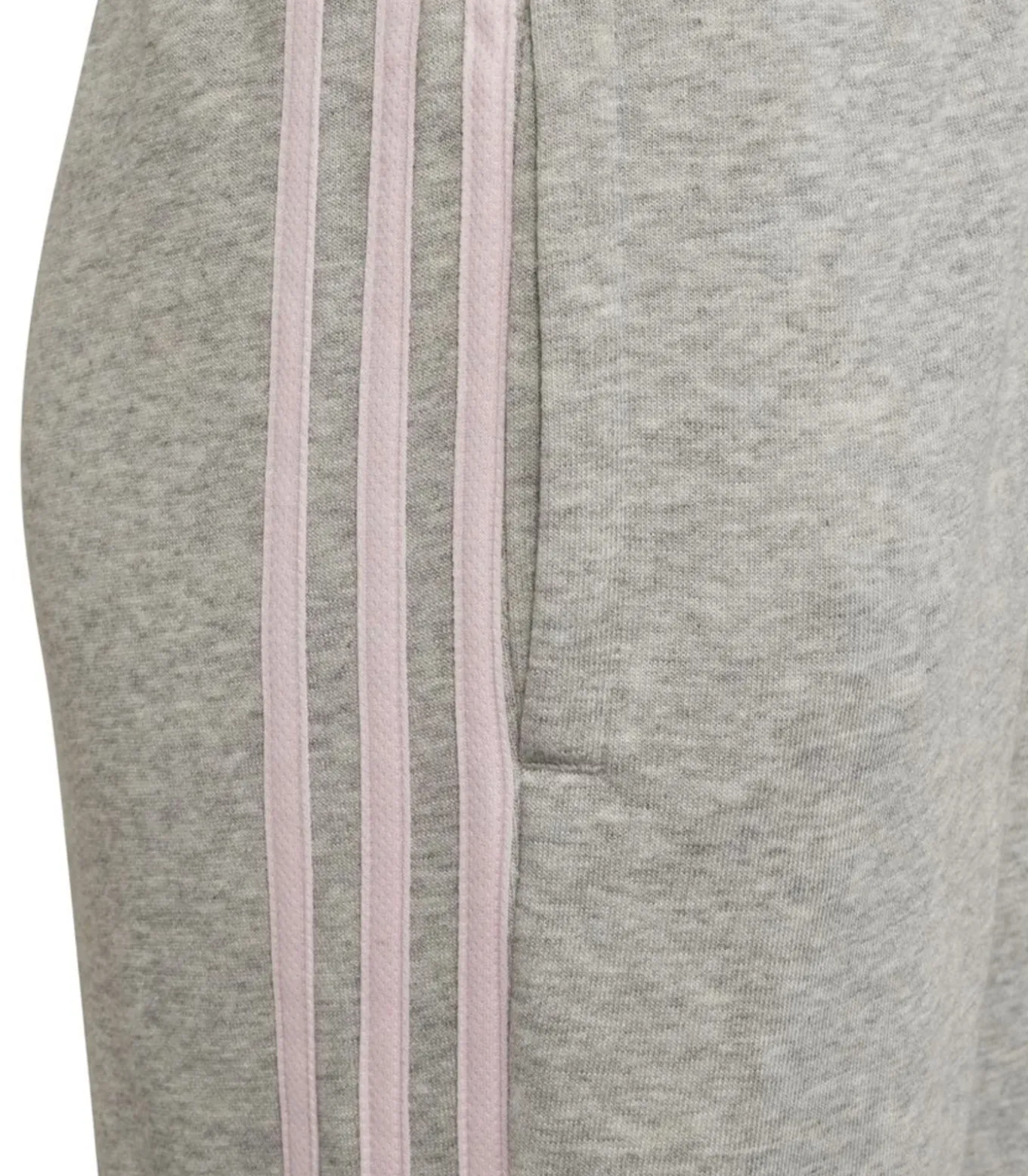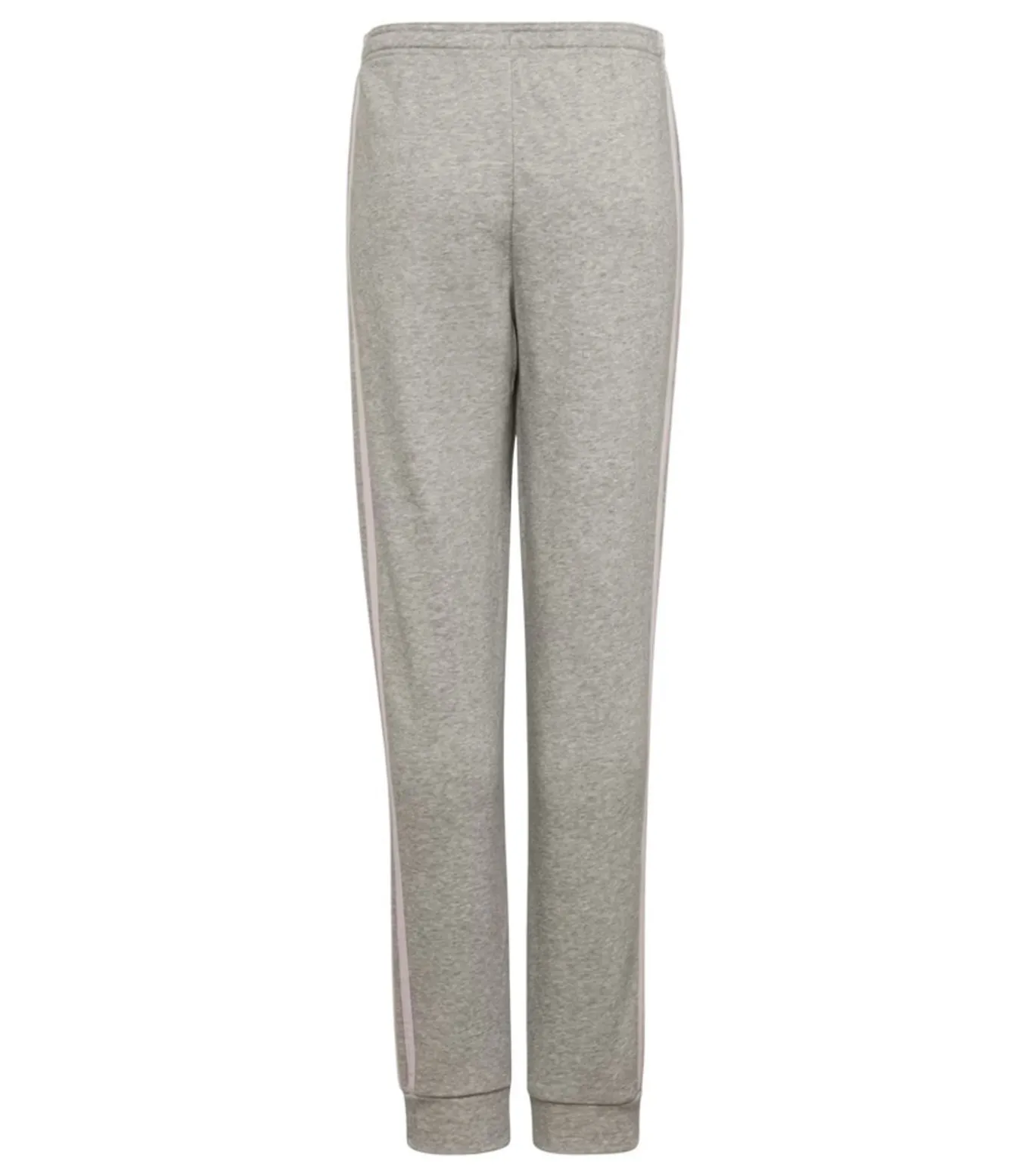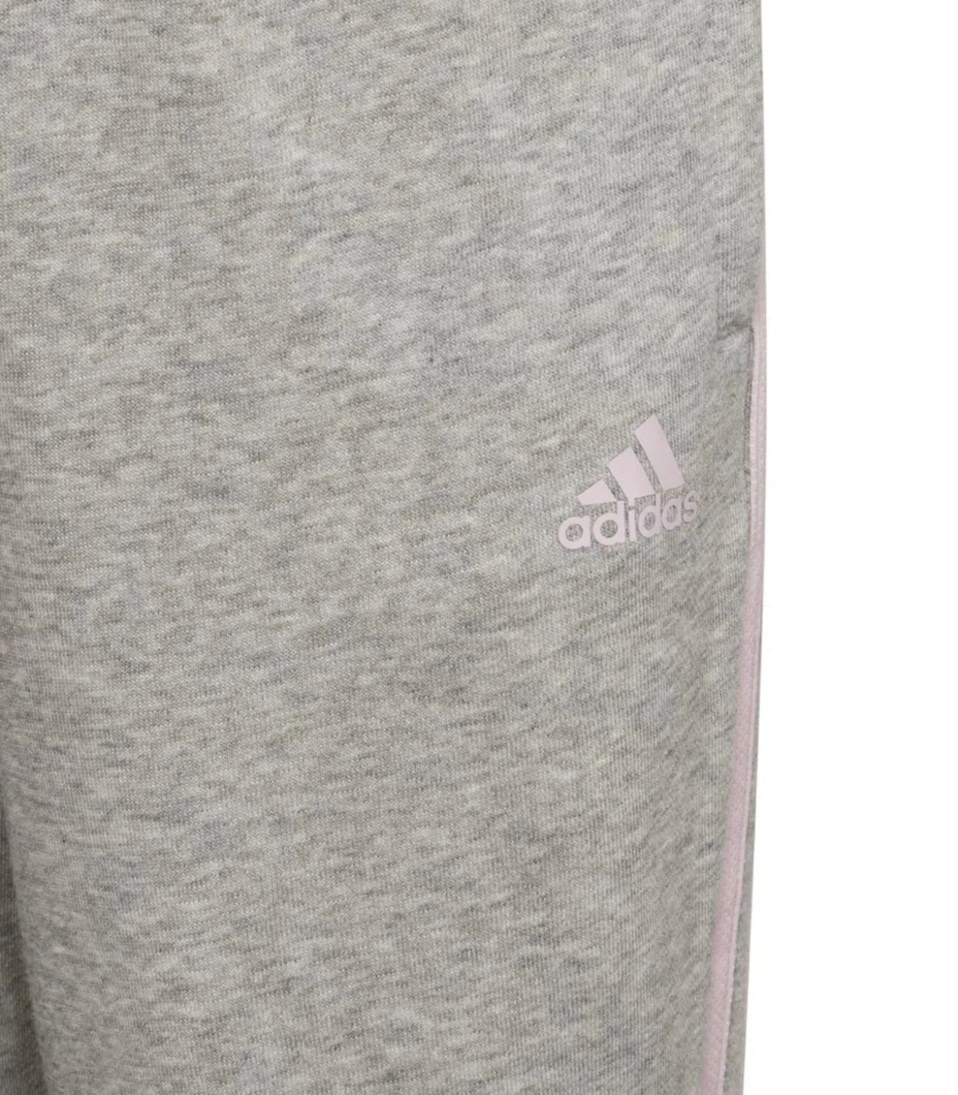 Adidas–merk je joggingbroek met grijs design, waarbij 53% katoen en 36% gerecycled polyester toegepast zijn, samen met 11% viscose. Het stof van deze broek is gefranseerd badstof. Het ontwerp van dit model omvat een Adidas–logo en zijstreep. Dit joggingbroek beschikt over twee zijzakken. De tailleband is van kord en elastisch. (Translated: Adidas grey–colored jogging pants with a design made of 53% cotton, 36% recycled polyester and 11% viscose. The fabric of this pant is French terry cloth. The design includes an Adidas logo and side stripe. This jogging pant has two side pockets. The waistband is made of cord and elastic.)