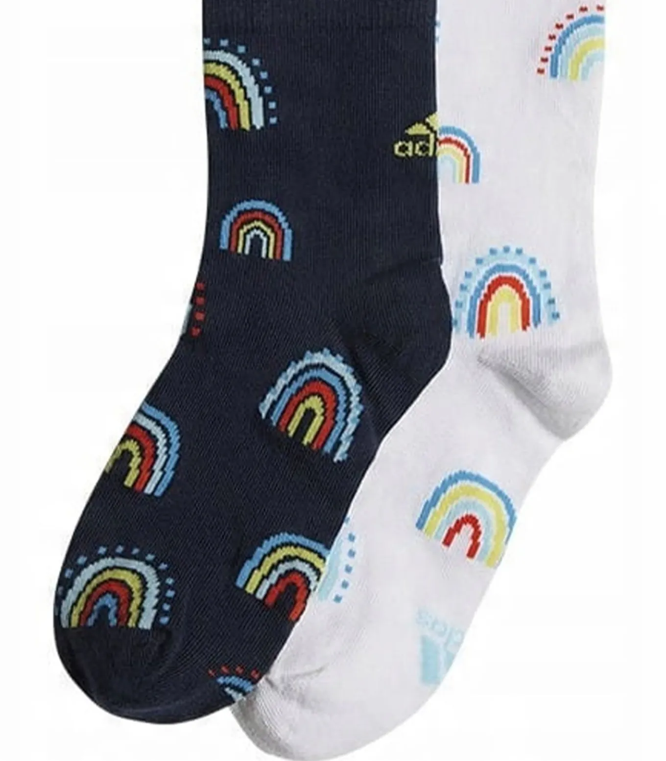 Adidas Witte Sokken met Logo, gemaakt van 68% katoen, 30% gerecycled polyester en 2% elastaan. Deze sokken hebben zacht aanrakende en strechmateriaal voor een comfortabele fit. Het ontwerp is contrast gestreept met het bekende Adidas logo en regenboog. Verder kenmerkt het design zich door elastische manchetten.