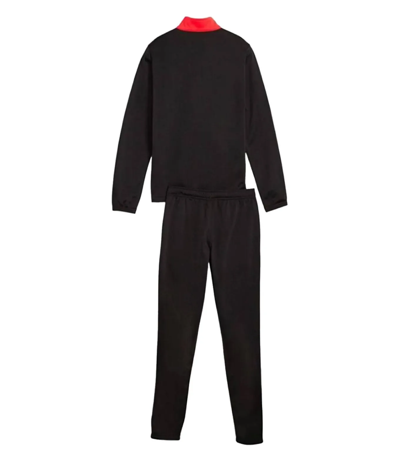 Puma–merk trainingspak met zwart logo, volledig gemaakt van polyester. Het ontwerp is contrastrijk met het Puma–logo. Het pak heeft twee zijzakken. De taillelijn wordt aangegeven door een tekenkoord. De manchetten zijn elastisch. Het type mouw is met lange mouwen. De halslijn is staand. De sluiting is volledig, af te trekken. Het pak bevat één broekje en één jasje. Het pak is flexibel. De maat is 37 in voor de lengte van 16 jaar.