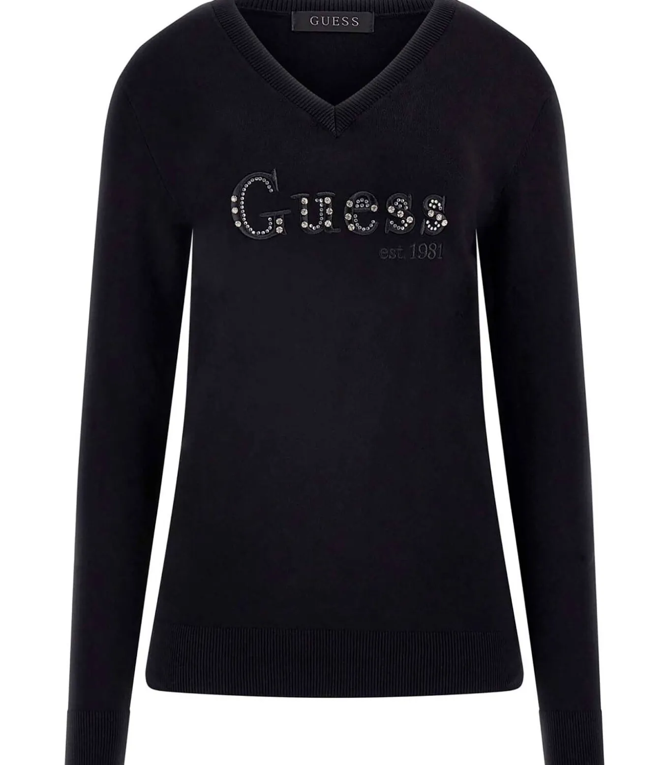 Kleur: Jet Black. Samenstelling: 82% viscose, 16% polyamide, 2% elastaan. Mouwen: lang. Halslijn: V–hals. Details: Logo op de voorkant versierd met felle Guess strass–steentjes (opgericht in 1981). Gebruik: Perfect om dagelijkse outfits een elegante en vrouwelijke touch te geven, ideaal te combineren met jeans of rokken voor een verfijnde en glamoureuze look.
