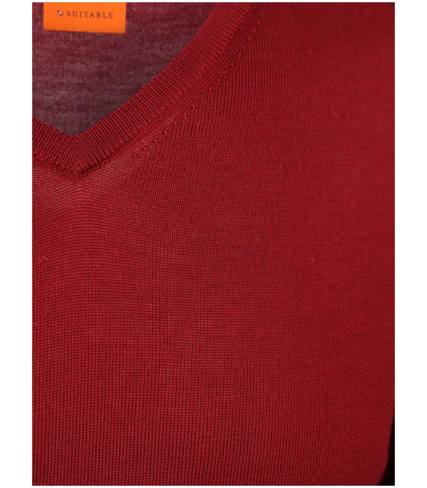 Deze trui van Suitable is een musthave voor in je garderobe. De pullover heeft een getailleerde pasvorm en is afgewerkt met een v–hals en elastische boorden. Daarnaast is de trui gemaakt van merinowol, waardoor de trui vormvast, hygienisch, ademend en temperatuurregulerend is, waardoor de trui een hoog draagcomfort heeft. Rode kleurSlim–Fit pasvormGemaakt van 100% merino wolErg comfortabel en zacht