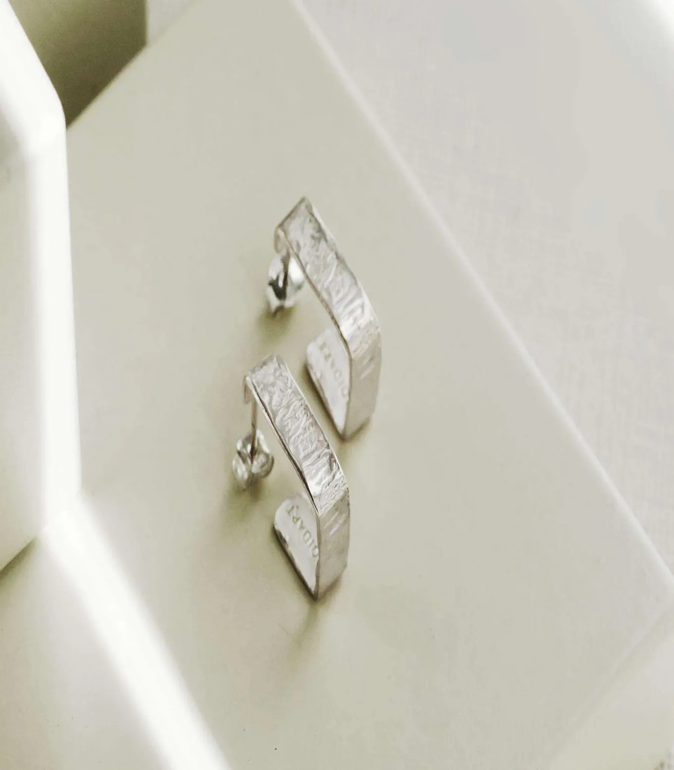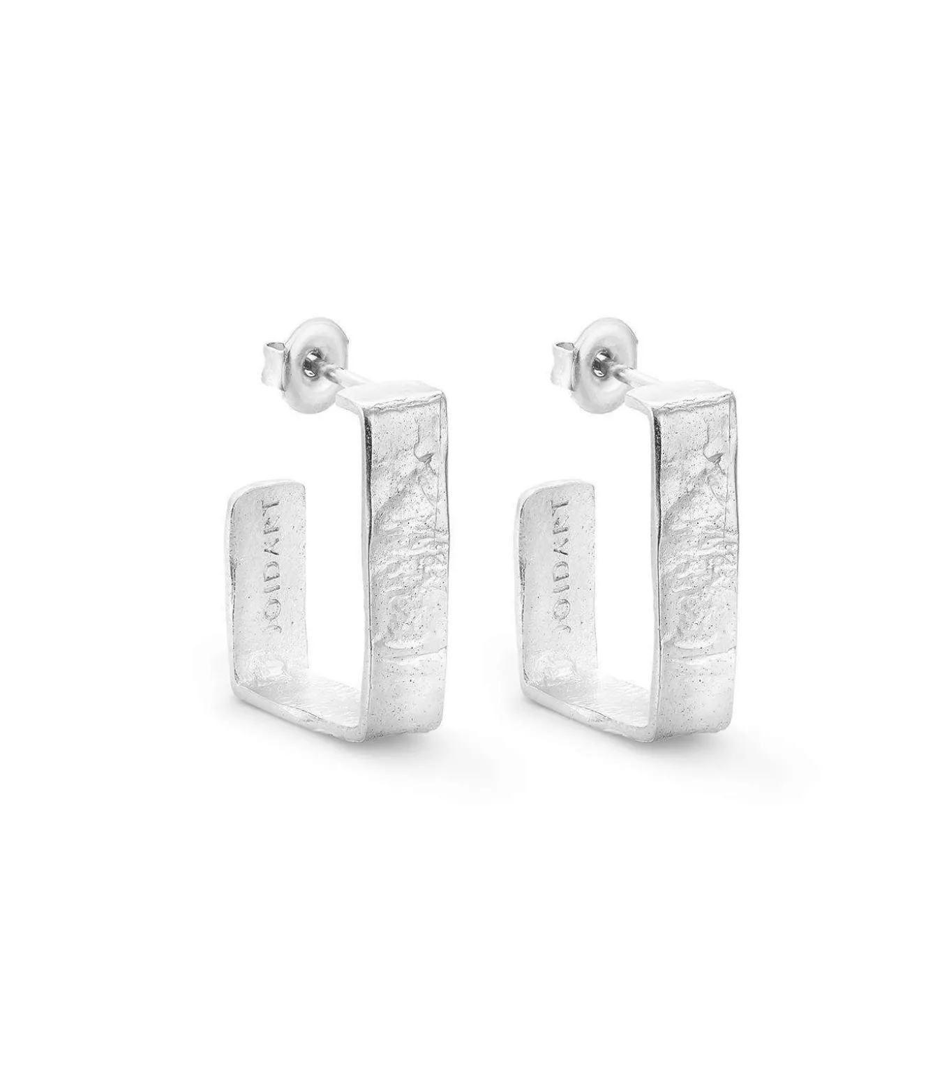 Middelgrote, rechthoekige oorbellen van mat glanzend 925 zilver met een platina coating. Groot ontwerp met texturen die doen denken aan de schors van sommige mediterrane bomen. Vlindersluiting.