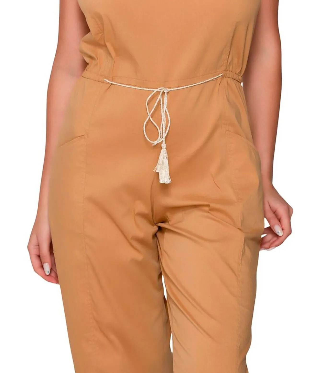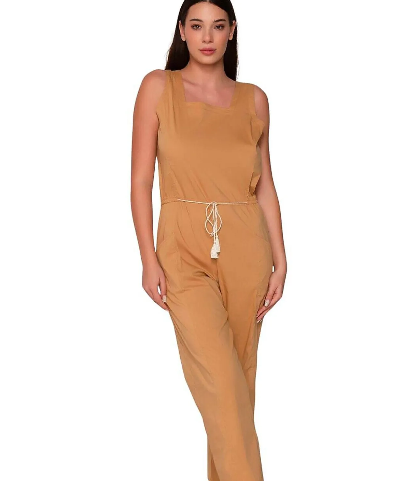 Een mouwloze jumpsuit die zowel elegant als casual is. Een opstaande kraag, licht vierkant aan de voorkant, geeft een moderne structuur aan de halslijn. Een diepe V–hals aan de achterkant voegt een sensuele, vrouwelijke touch toe. De taille wordt gemarkeerd door een wit trekkoord met kwastjes, waardoor de pasvorm aan het lichaam kan worden aangepast en een bohemienachtig tintje krijgt. De broek heeft een rechte, losse pasvorm met een lengte van 7/8 die boven de enkels stopt, voor comfort en luchtigheid. Praktische steekzakken en een kleine logopatch op de achterkant ter hoogte van de taille. De stof is een mix van katoen en polyamide, licht en vloeiend, perfect voor zomerse dagen. Ideaal om in de zomer te dragen, binnen of buiten, voor een casual maar gepolijste look.