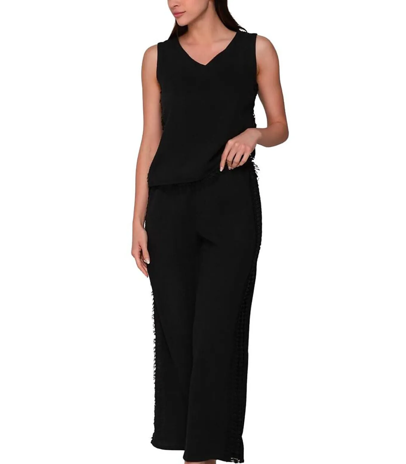 Deze mouwloze top is gemaakt van een lichtgewicht katoenen stof met een reliëfstructuur. Het heeft een eenvoudige, elegante V–halslijn. De zijkanten en zoom zijn versierd met delicate macramédetails die een vleugje verfijning en vrouwelijkheid aan het ensemble toevoegen. De stijl is zowel casual als chic, perfect voor zomerse dagen.[Top apart verkrijgbaar. Het broekje, de sieraden en andere accessoires die het model op de foto’s draagt, zijn niet inbegrepen].