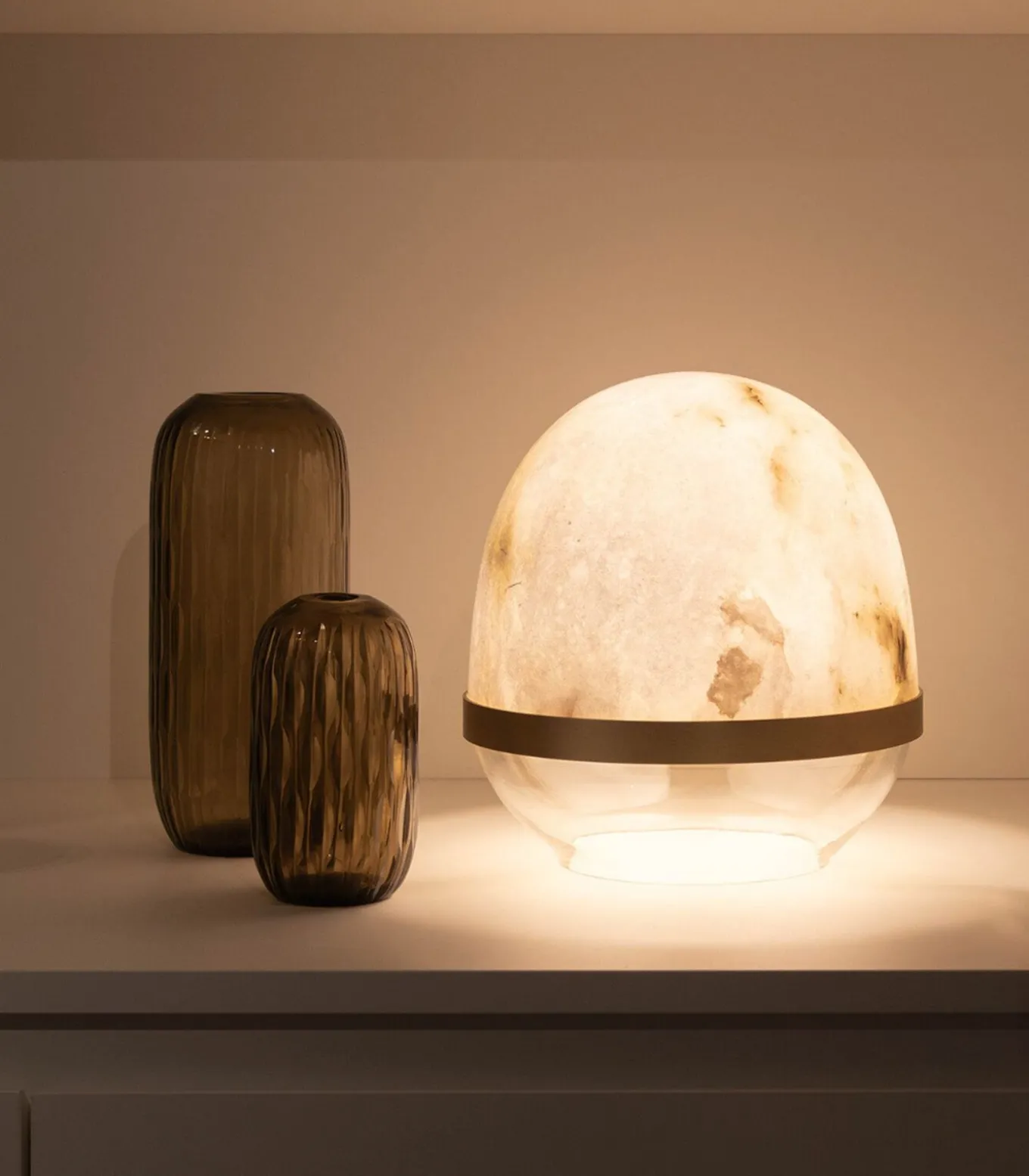 De Nice tafellamp combineert luxe materialen en elegant design. De ovaalvormige kap van natuurlijk alabaster verspreidt een prachtige gloed wanneer de lamp brandt. De voet van antique brass en glas voegt een klassieke touch toe, terwijl de plastic kabel praktisch en duurzaam is. Uitgerust met een E27–fitting, biedt de lamp sfeervolle verlichting en een tijdloze uitstraling.