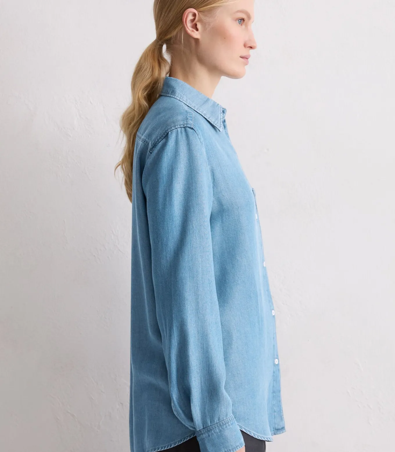 Jeans zijn dit seizoen weer helemaal on trend – en niet alleen als broek. Een nieuwe, veelzijdige en tijdloze stijl is de casual, loszittende blouse van superzachte, vloeiende lyocell denimstof. Het heeft klassieke details zoals de smalle Kent–kraag, knoopsluiting, klassieke blousemouwen, rugstuk met plooi en kenmerkende afgeronde zoomlijn. Onze stylingtip: combineer denim met denim. De totale look in jeans ziet er niet alleen cool, maar ook elegant uit.