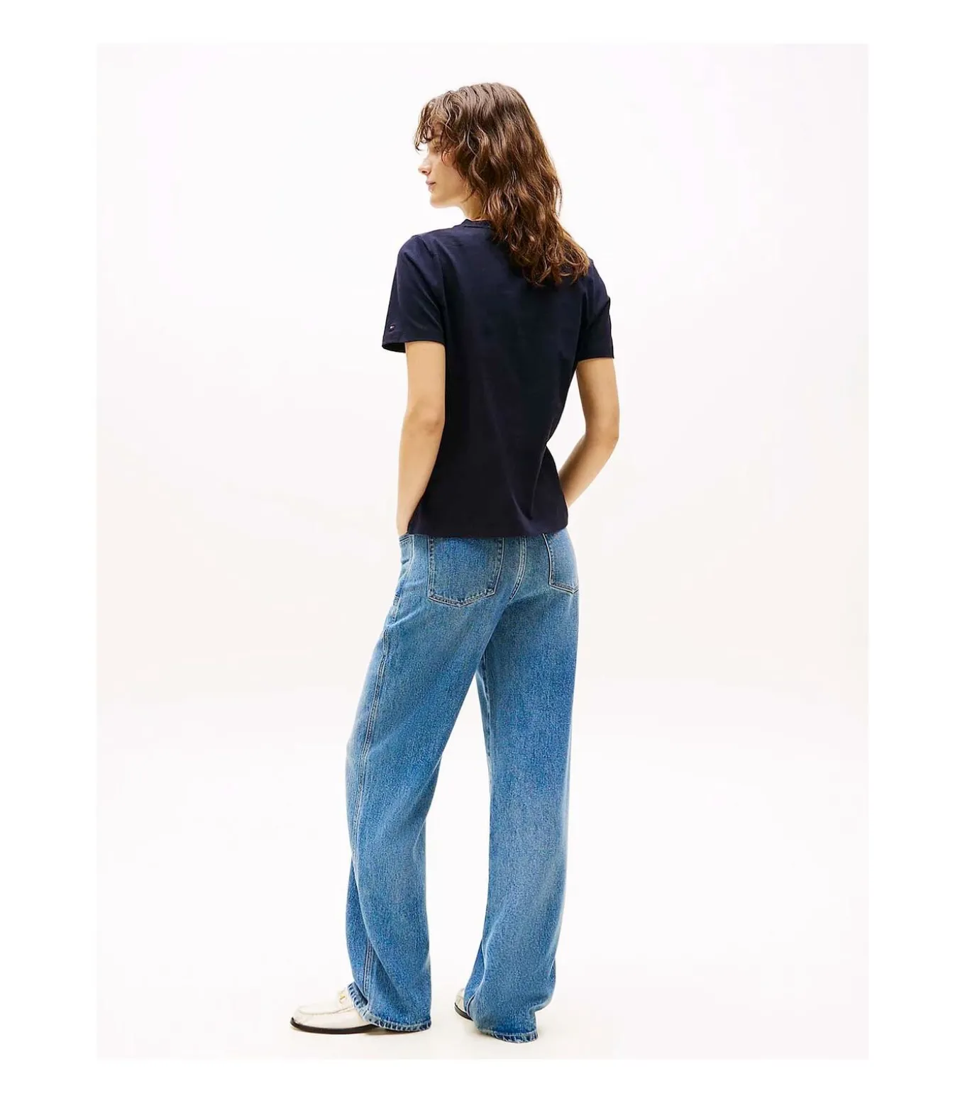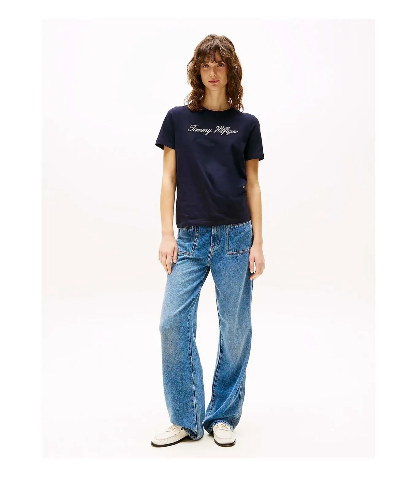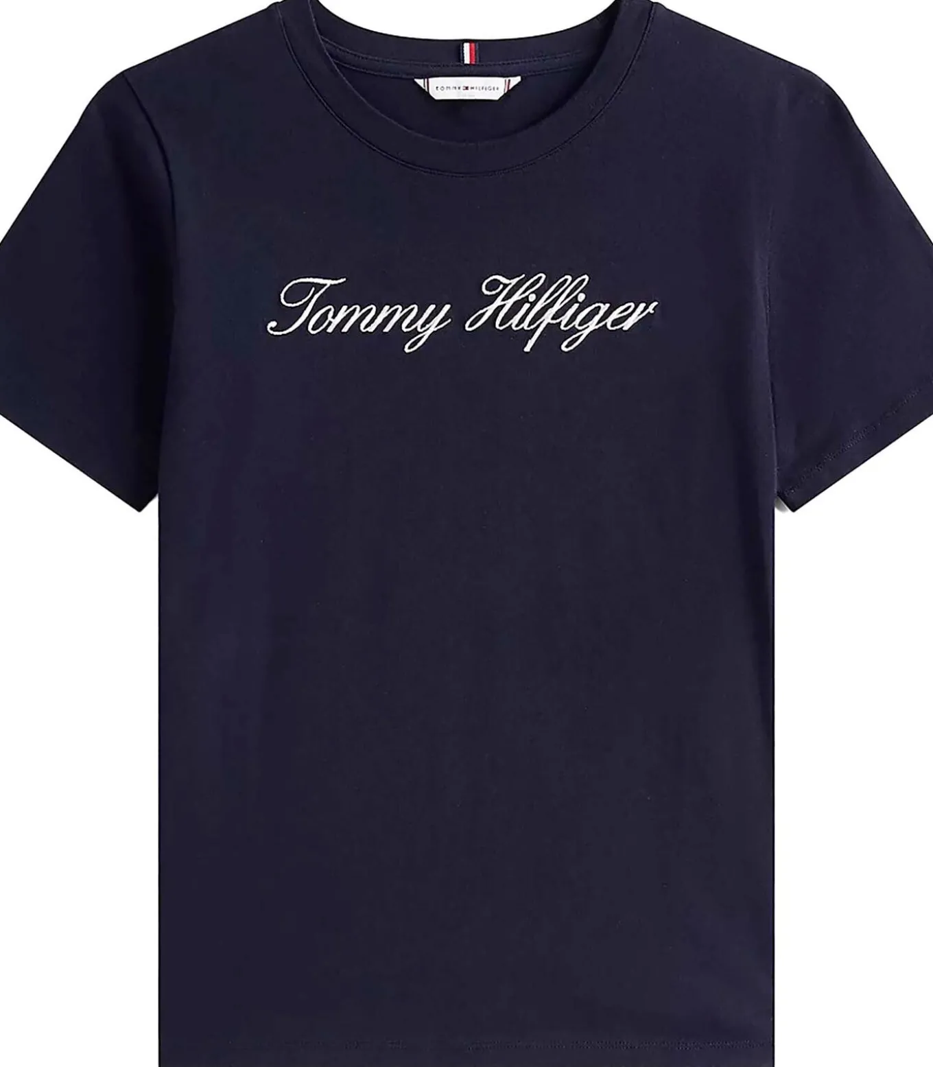Kleur: Nos marineblauw. Samenstelling: 100% biologisch katoen. Mouwen: kort. Halslijn: ronde hals. Pasvorm: regular fit. Details: Tommy Hilfiger–logo in cursieve letters op de borst. Duurzaamheid: gemaakt van gecertificeerd biologisch katoen. Gebruik: veelzijdig en comfortabel, perfect voor casual dagelijkse outfits met een exclusieve touch.