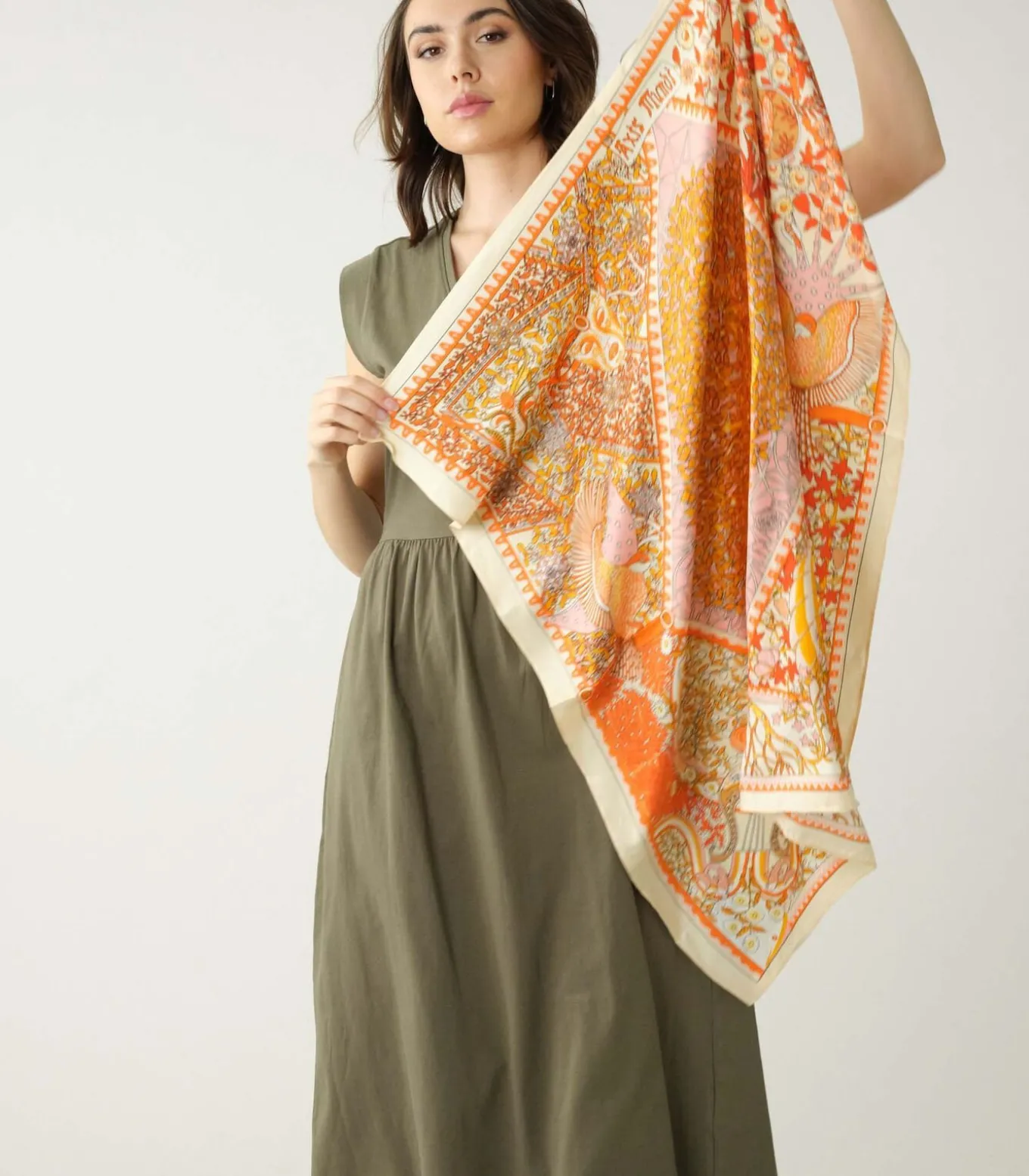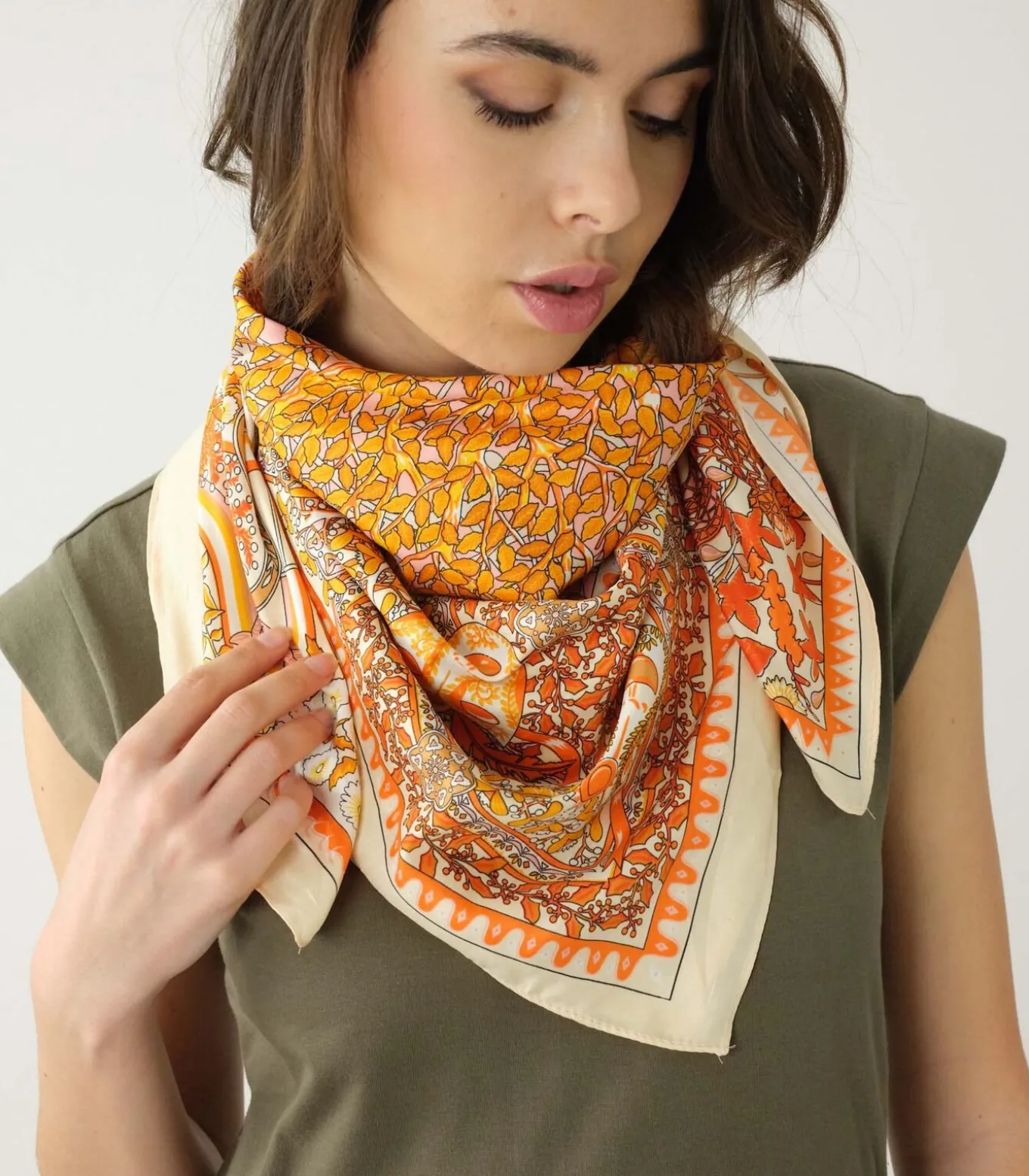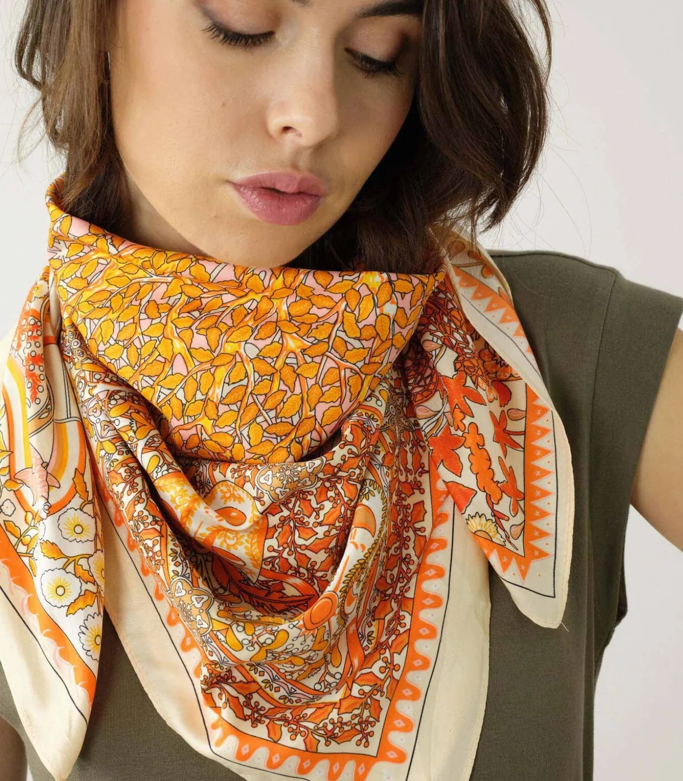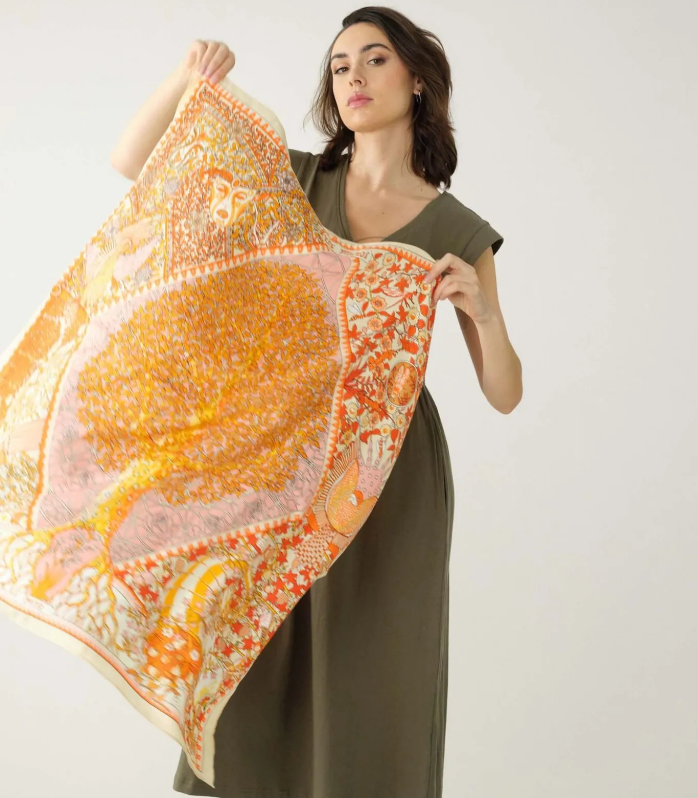 Sjaal met plantenprint. Oranje sjaal met OANA–patroon.