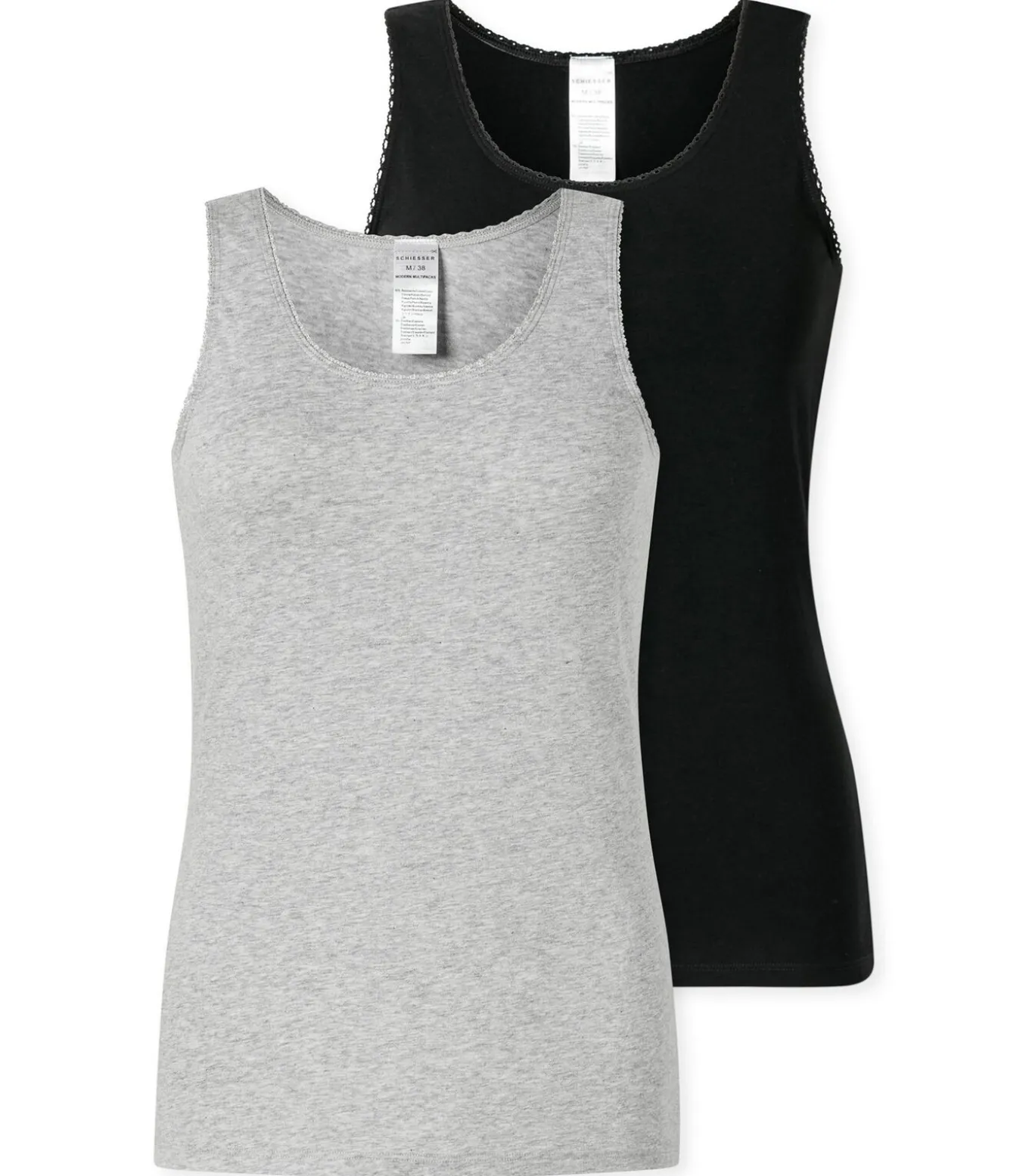 Strappy damestops van het merk SCHIESSER. In een praktische dubbele verpakking. Mouwloos met een smalle kanten band, elastisch katoen jersey.
