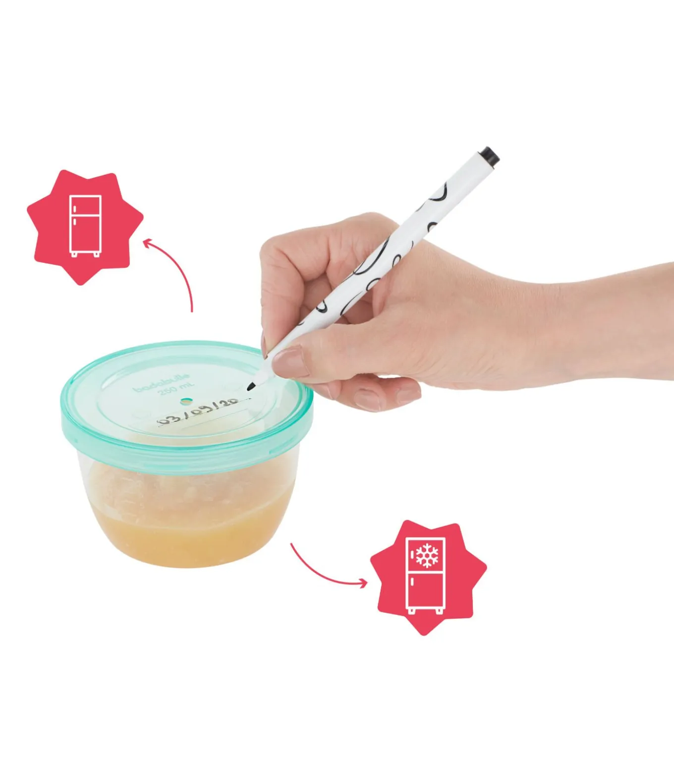 Grote inhoud van 250 ml met hermetisch schroefdeksel Zichtbare schaal (in ml) en herschrijfbaar oppervlak op het deksel Magnetron– en vaatwasmachinebestendig Geschikt voor koelkast en vriezer, BPA vrij
