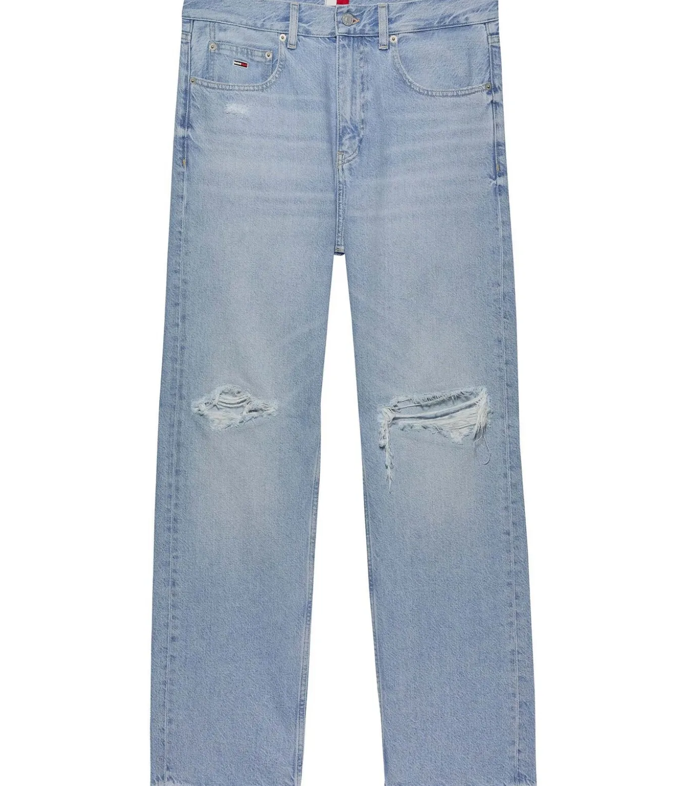 Kleur: Licht denim Samenstelling: 82% katoen, 18% lyocell Lengte: Lang Pasvorm: Regular fit Sluiting: Knoop Details: Licht gewassen jeans met scheuren op de knieën en versleten details op de achterzak, Tommy Jeans leren patch en geborduurde vlag Gebruik: Ideaal voor een eigentijdse casual stijl met een vintage en relaxte touch