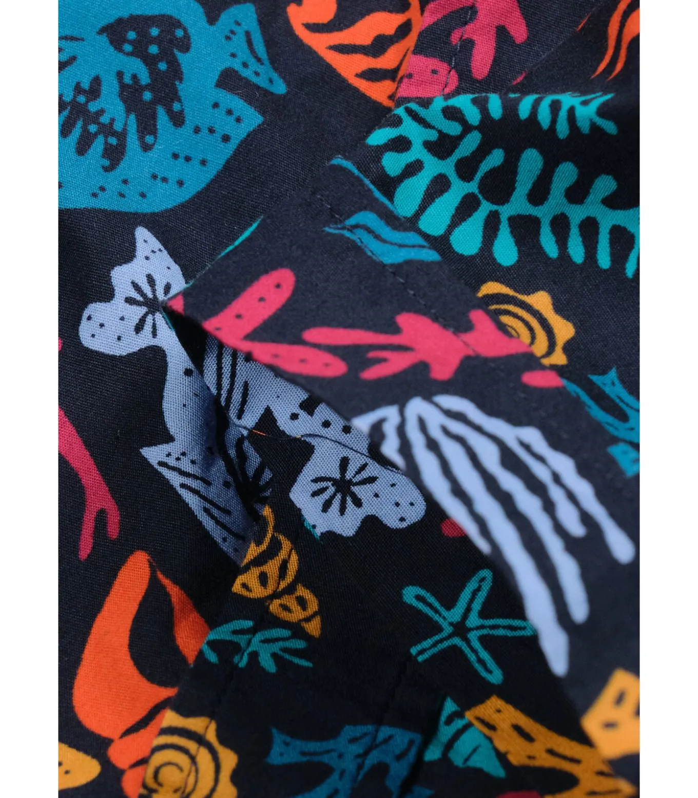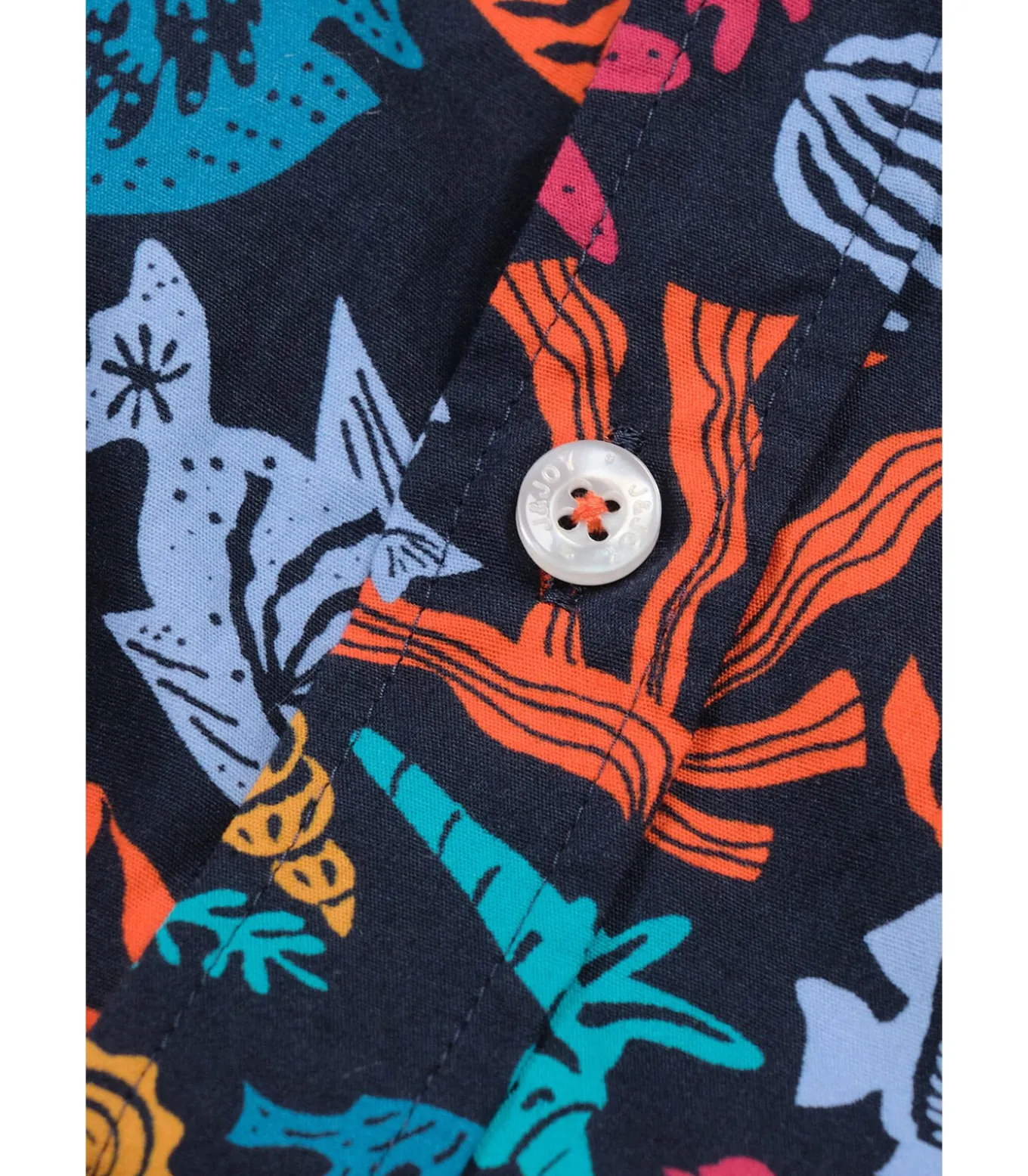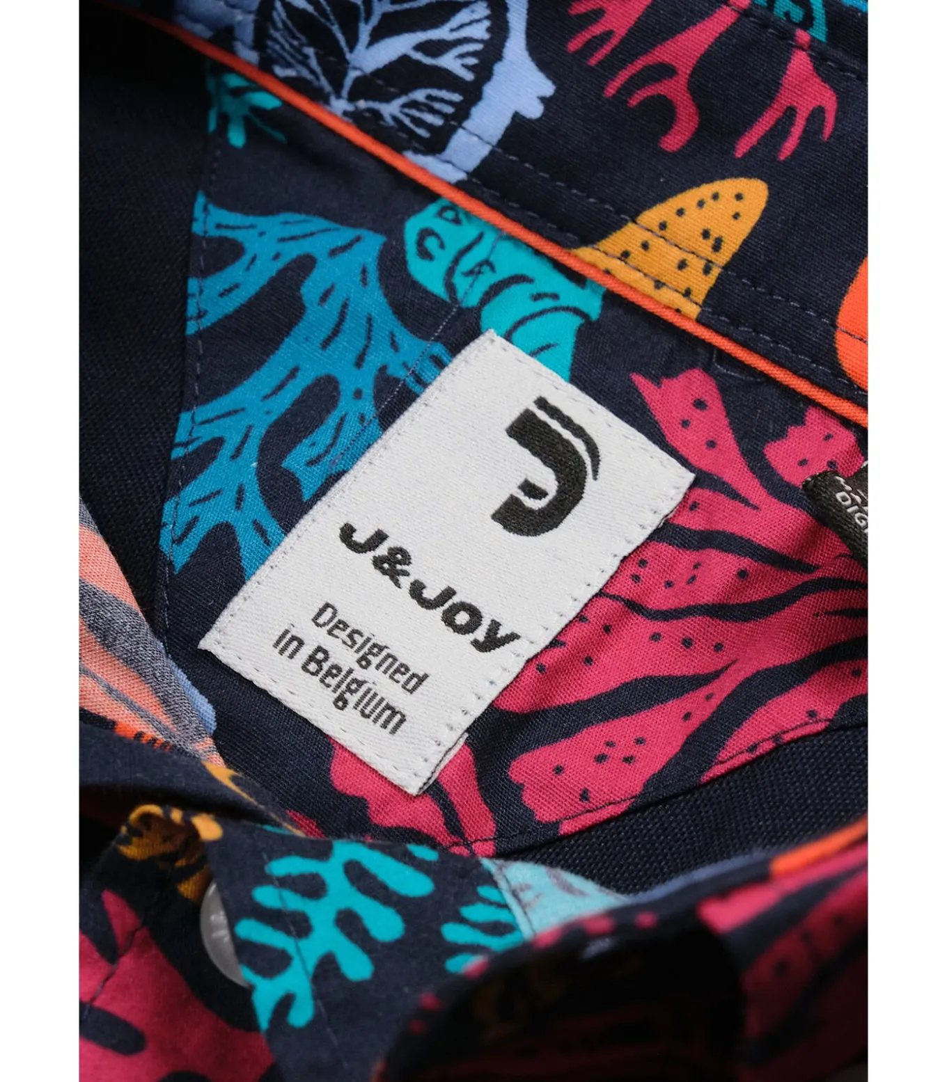 Zeer zacht blauw, verbeterd met een koraalprint voor dit mooie shirt. Het materiaal is 100% katoen. De snit is recht. De kraag is klassiek met tips met knoop. Het J & Joy –logo is geborduurd op de borst. Dit stuk brengt je in onderdompeling naar het Marine Universe van Monterey Bay, aan de westkust van de Verenigde Staten, een regio waarvan deze collectie is geïnspireerd.