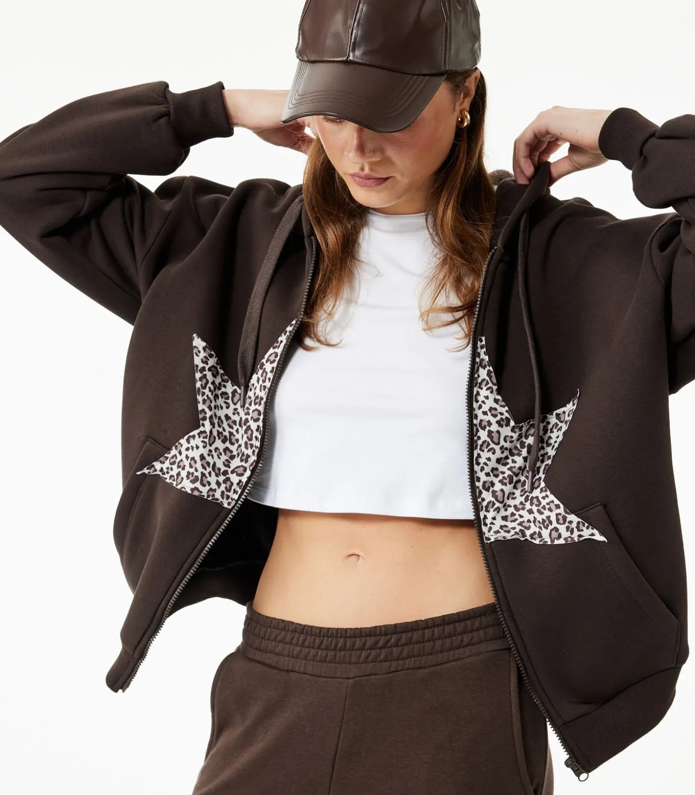 Geniet van comfort en stijl met deze oversized hoodie sweatshirt, perfect voor koude dagen. De zachte stof met capuchon en rits biedt extra warmte, terwijl de grote kangoeroezak praktische opbergruimte geeft. De opvallende sterapplicatie met luipaardprint voegt een speelse twist toe aan je dagelijkse look. Combineer het met een basic T–shirt en een hoge taille jogger voor een sportieve uitstraling. Complementeer je outfit met sneakers en een rugzak voor een dynamische uitstraling. Ideaal voor dagelijks casual gebruik.