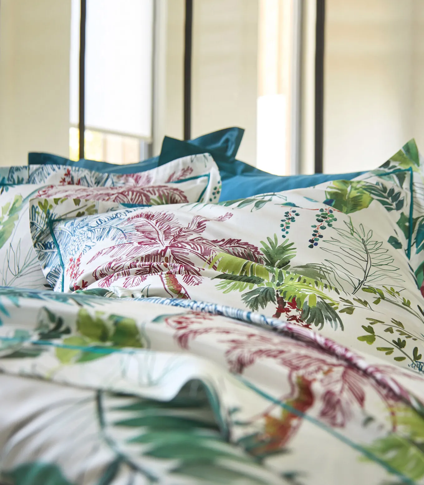 Sublieme versiering met tropische patronen.–Satijn 100% gekamde katoen 120 draad/cm²– Laken met volant en hommel– Gemaakt in FrankrijkBlanc des Vosges, de uitmuntendheid van de Franse productie.Sinds 1843 vervaardigen wij ons huishoudlinnen in onze fabriek in Gérardmer (Vogezen–88)