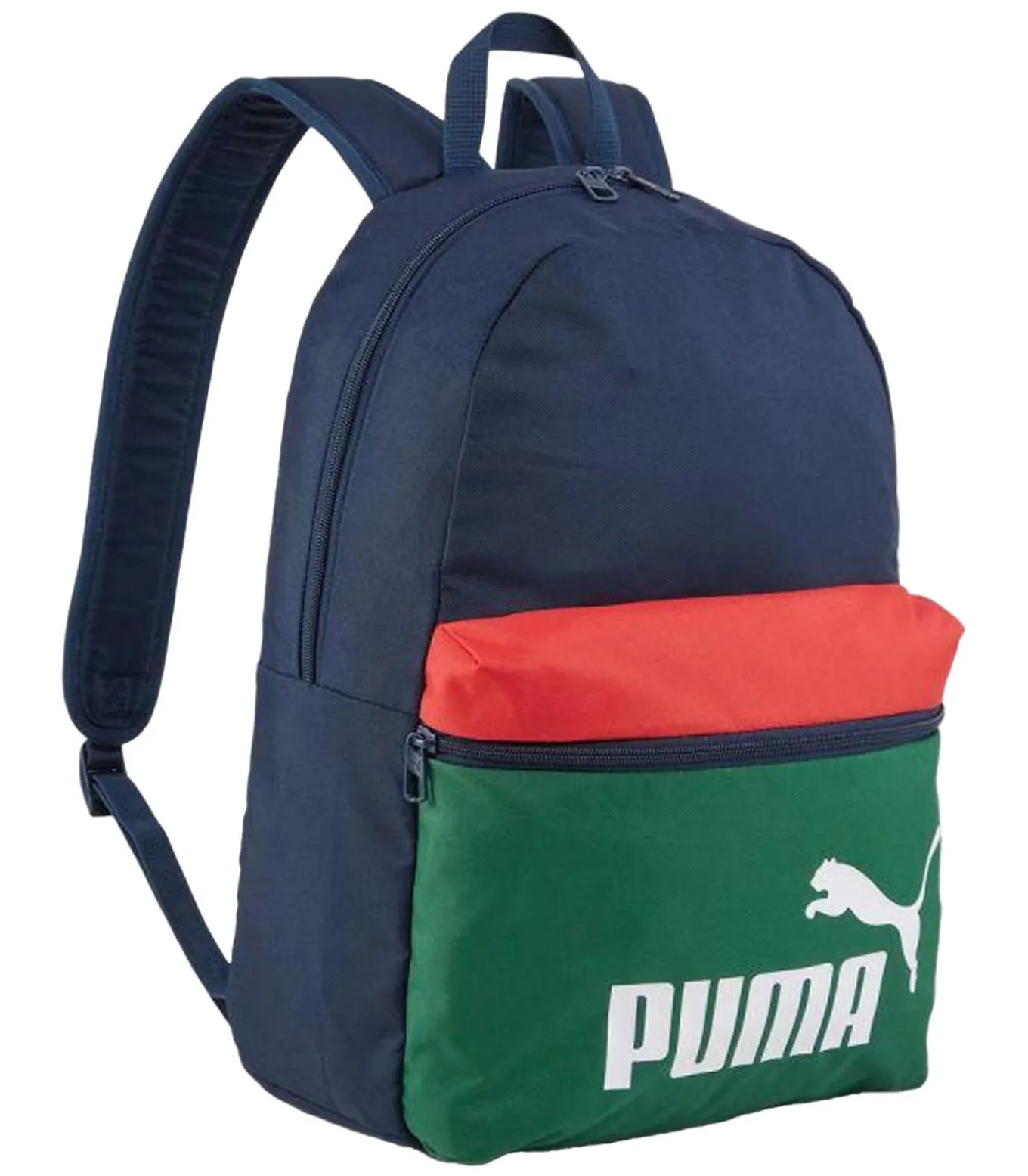 Puma PHASE–ruzak Marineblauw is een 100% polyester rugzak met een hoogte van 44 cm, breedte van 30 cm en een capaciteit van 22 L. De diepte bedraagt 14 cm en de zak heeft een voorzak, rits, één zijzak en een gaaszak. Het handvat is gewatteerd, de schouderriemen zijn verstelbaar en de rugpaneel is eveneens gewatteerd. Dit ontwerp toont een kleurenblok met het logo van Puma. Deze zak is gemaakt van hergebruikte materialen en wordt vastgehouden met een tweewegrits.