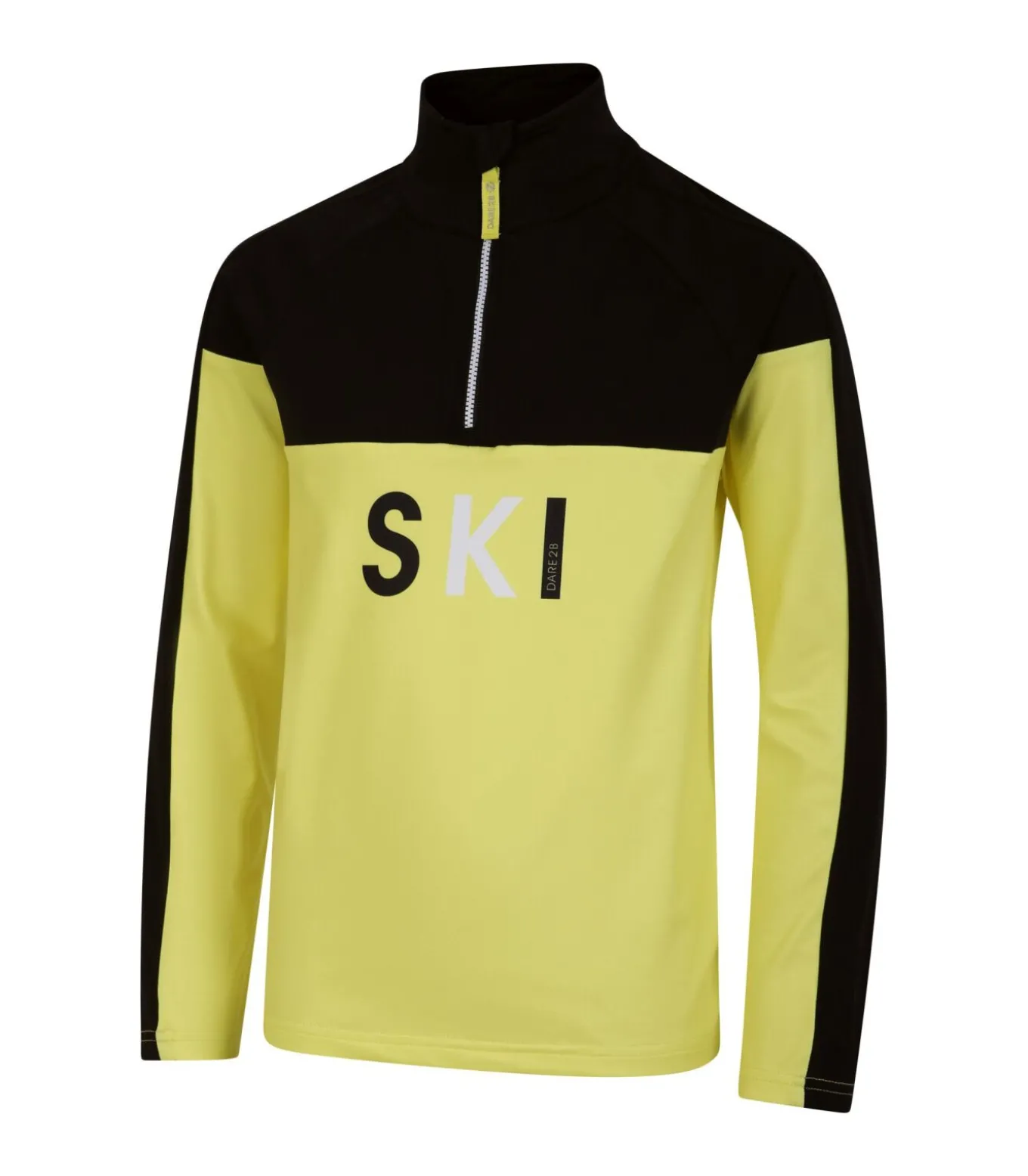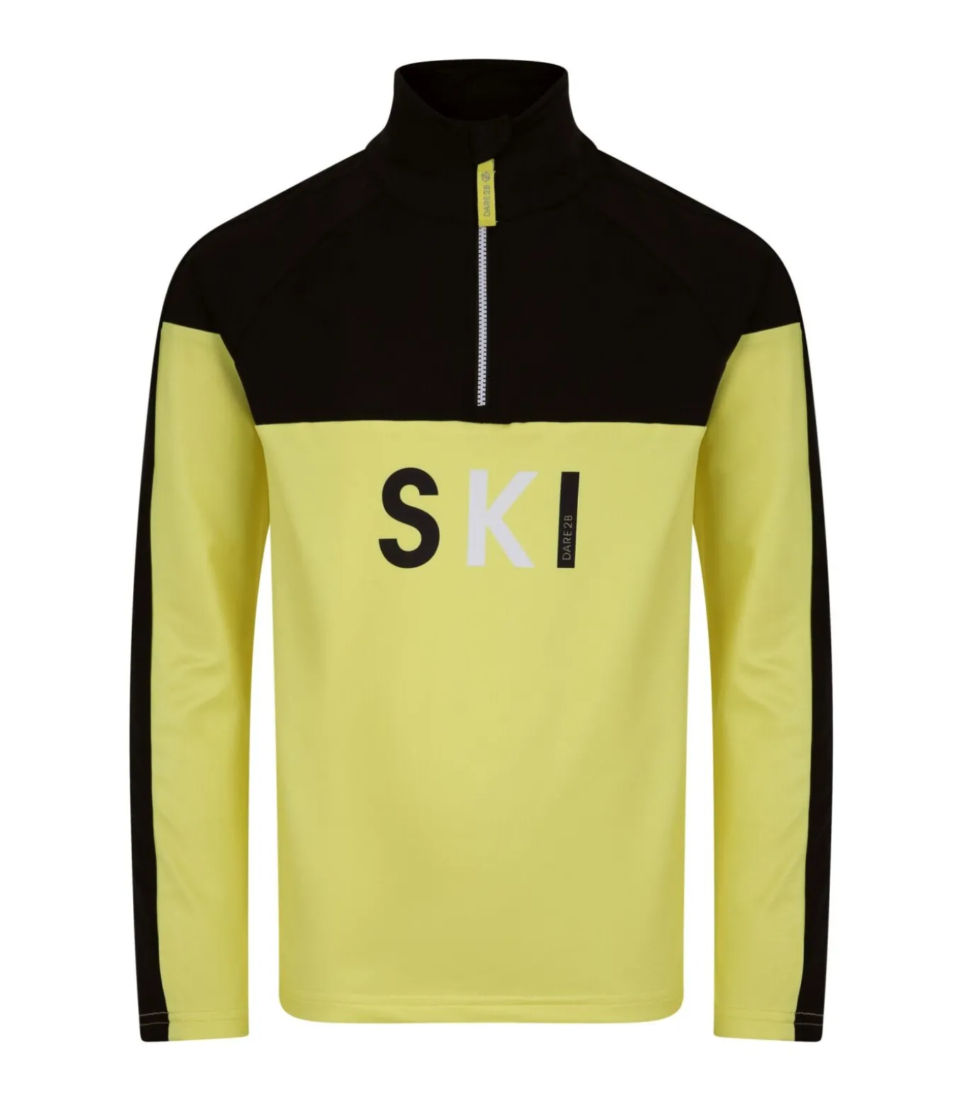 Dit product is een kinderpullover gemaakt door Dare 2B. Hij bestaat uit 95% gerecycled polyester en 5% elastaan. De stof is een 4–weg stretchmateriaal met de naam Illus Core Stretch dat sneldrogend is. Het ontwerp heeft contrasterende kleuren en texturen met logo en tekstelementen. Een rits met merkopdruk sluit de 1/4 lange rits op de opstaande kraag van de top met lange mouwen.