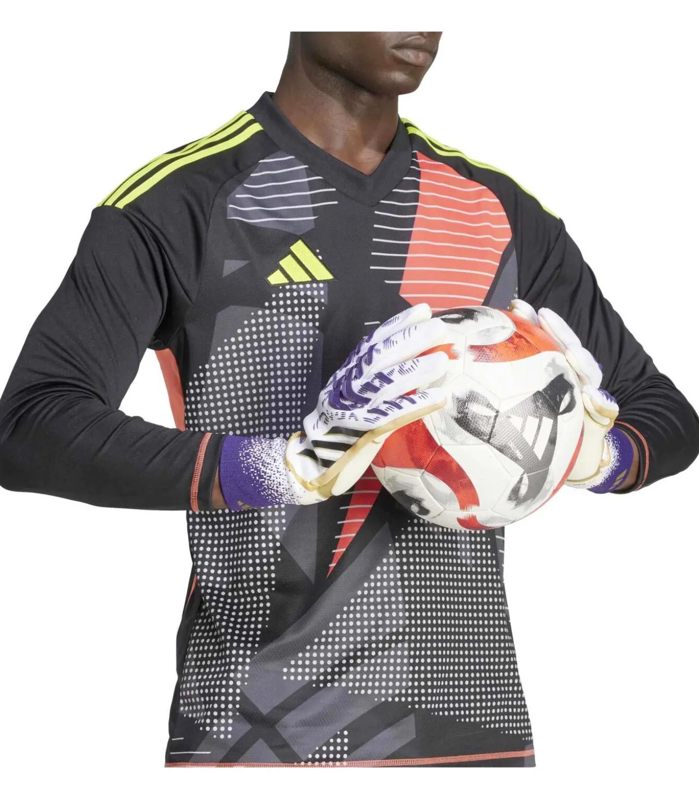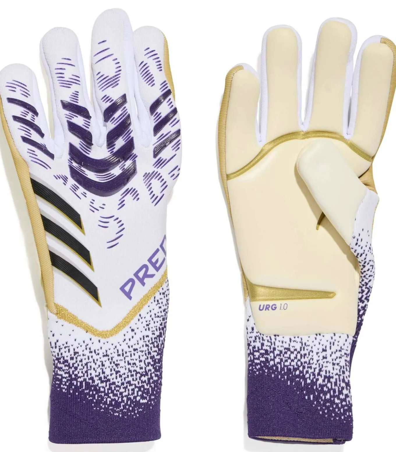 Kleur: Wit / Zwart / Aurora Plum Samenstelling: 91% gerecycled polyester, 8% elastaan, 1% nylon Details: URG 2.0 latex handpalm voor optimale grip, negatieve snit voor een nauwsluitende pasvorm, gebreide handrug met siliconen inzetstukken voor nauwkeurige blokkering, verlengde latex duimgreep, strapless instap voor een natuurlijke en stabiele pasvorm Gebruik: Predator Pro keepershandschoenen, ideaal voor zelfverzekerde en responsieve prestaties in de wedstrijd