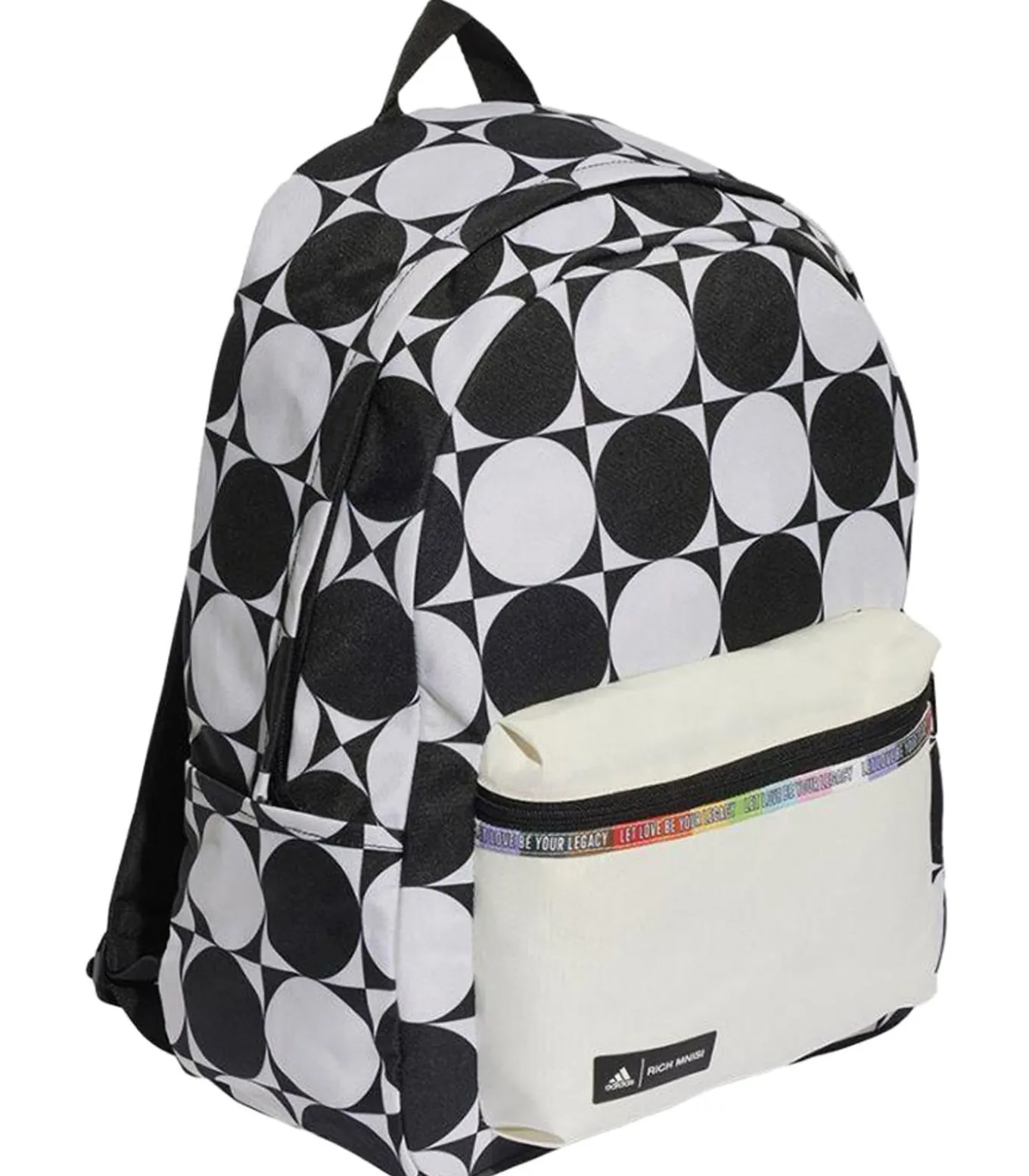 Adidas–merk rugzak met PRIDE–ontwerp in witkleur, gemaakt van 100% gerecycled polyester. Het materiaal is geweven en meet 44cm hoog, 35,9cm lang en 15cm breed. De rugzak heeft een inhoud van 22,5 liter en bevat één voorzak, een fles en een ritssluiting. Er zijn 1 hoofdcompartiment beschikbaar. De rugzak is gemaakt met duurzaam stoftechnologie. Het ontwerp bevat het Adidas logo, een monochroom rond ontwerp. De rugzak kan worden vastgehouden met een ritssluiting.