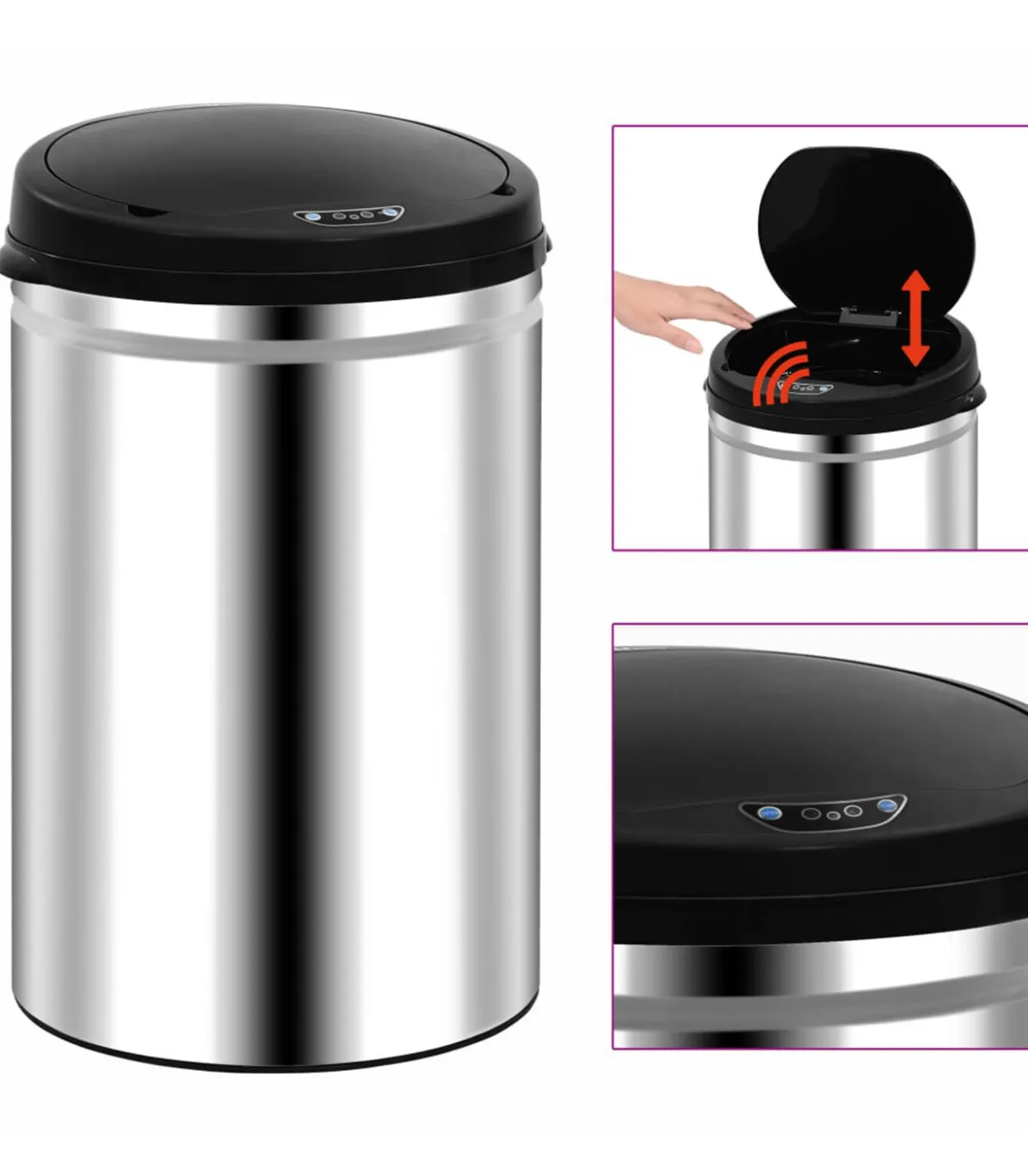 Deze prullenbak heeft een roestvrijstalen behuizing en een sterk ABS deksel, waardoor hij duurzaam en gemakkelijk schoon te maken is. Hij heeft een ring om de zak te bevestigen en het deksel kan eenvoudig worden afgenomen. Je kan de sensor uitschakelen om het deksel handmatig te openen en sluiten.