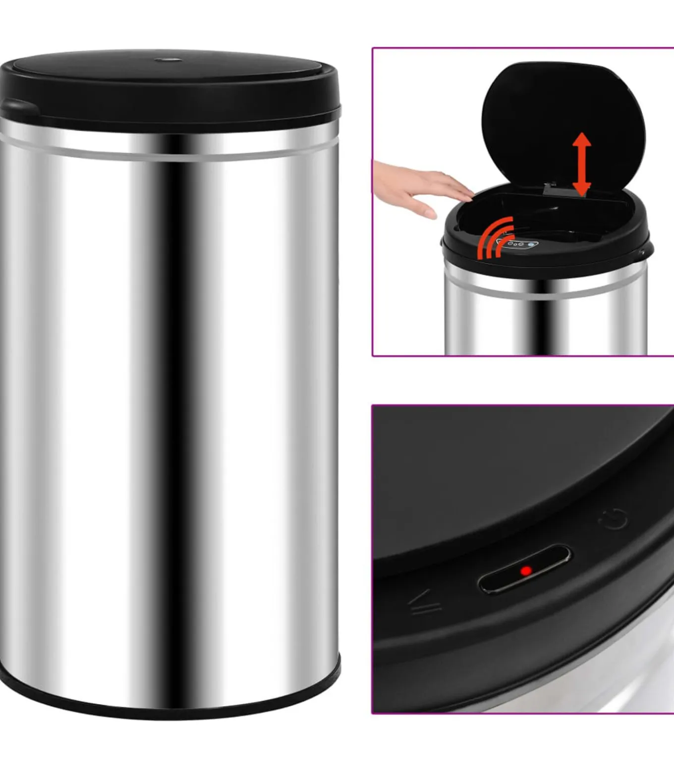 Deze prullenbak heeft een roestvrijstalen behuizing en een sterk ABS deksel, waardoor hij duurzaam en gemakkelijk schoon te maken is. Hij heeft een ring om de zak te bevestigen en het deksel kan eenvoudig worden afgenomen. Je kan de sensor uitschakelen om het deksel handmatig te openen en sluiten.