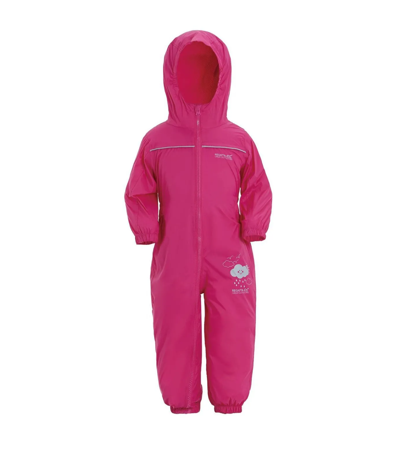 Dit regenpak voor peuters van Regatta Great Outdoors heeft een waterdichte en ademende constructie. Het pak is gemaakt van Isolite 5000 lichtgewicht polyamide stof die getapet is bij de naden om binnendringen van water te voorkomen. Een geïntegreerde capuchon zorgt voor extra bedekking. Reflecterende afwerking is toegevoegd voor zichtbaarheid bij weinig licht. De maatopties zijn bedoeld voor Regatta Little Adventurers en omvatten: 6–12 maanden (ongeveer 74–80 cm lang), 12–18 maanden (ongeveer 80–86 cm), 18–24 maanden (ongeveer 86–92 cm), 24–36 maanden (ongeveer 92–98 cm), 36–48 maanden (ongeveer 98–104 cm), 48–60 maanden (ongeveer 104–110 cm) en 60–72 maanden (ongeveer 110–116 cm). Het materiaal van het pak is 100% polyamide.