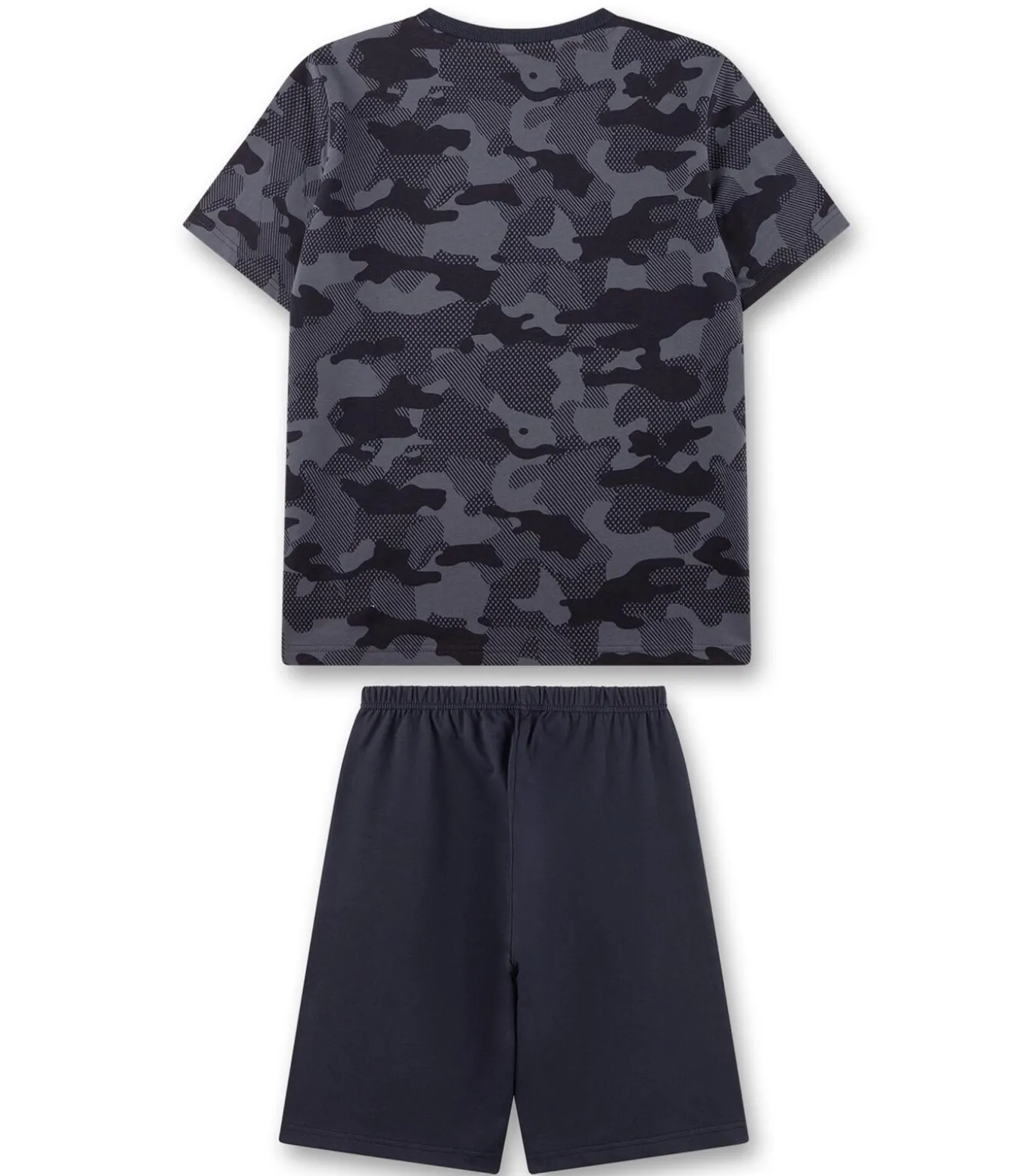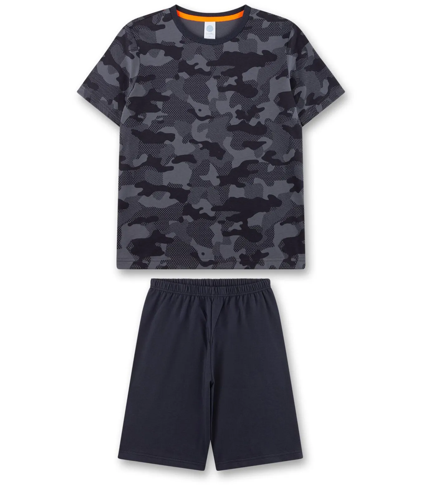 Korte pyjama voor jongens van het merk Sanetta. T–shirt met all–over print en ronde hals. Effen, kort pyjamabroekje.