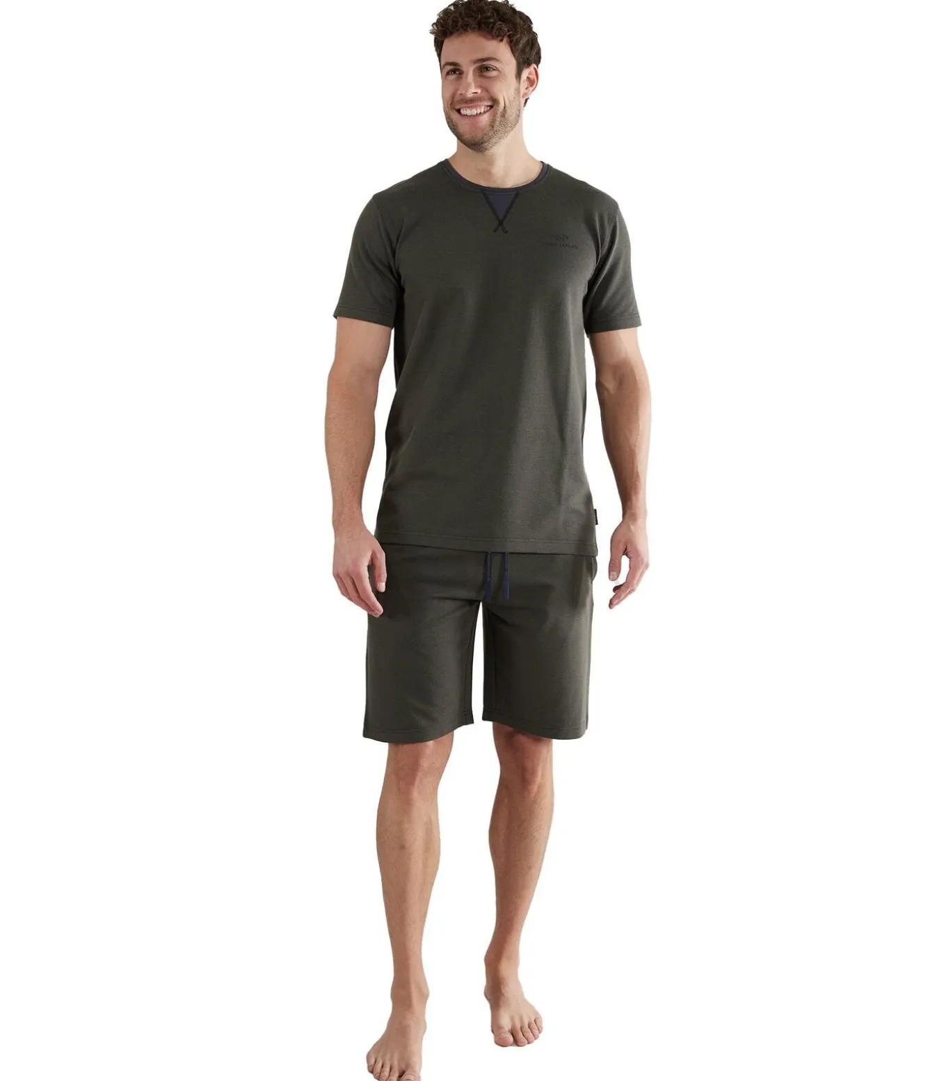 Herenpyjama van het merk TOM TAILOR. T–shirt met ronde hals en korte pyjamabroek. Aangename piquéstof.