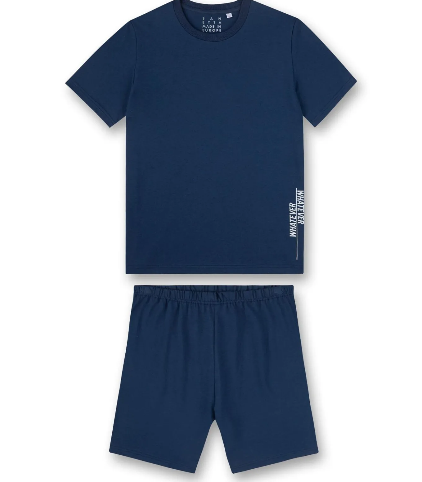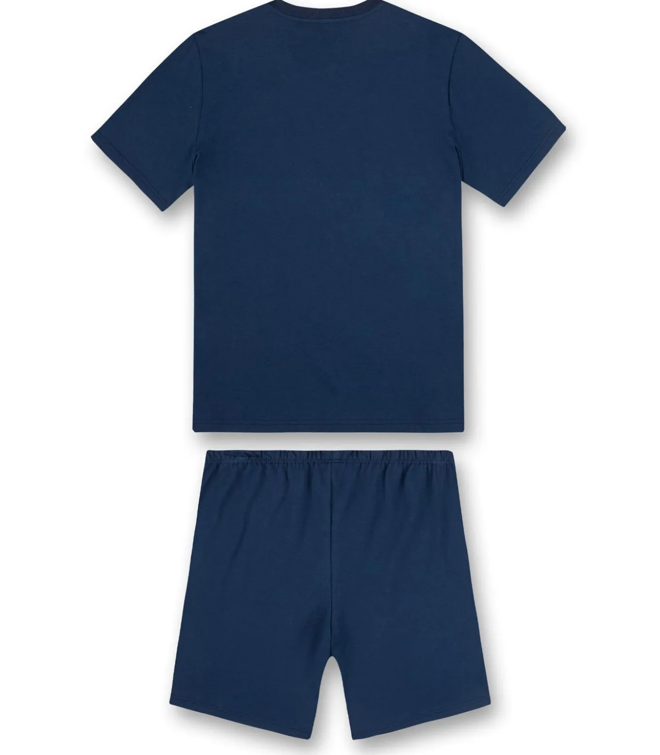 Pyjama voor jongens van het merk Sanetta. Top met ronde hals en kleine letters op de linkerkant. Korte effen broek met elastiek in de taille.