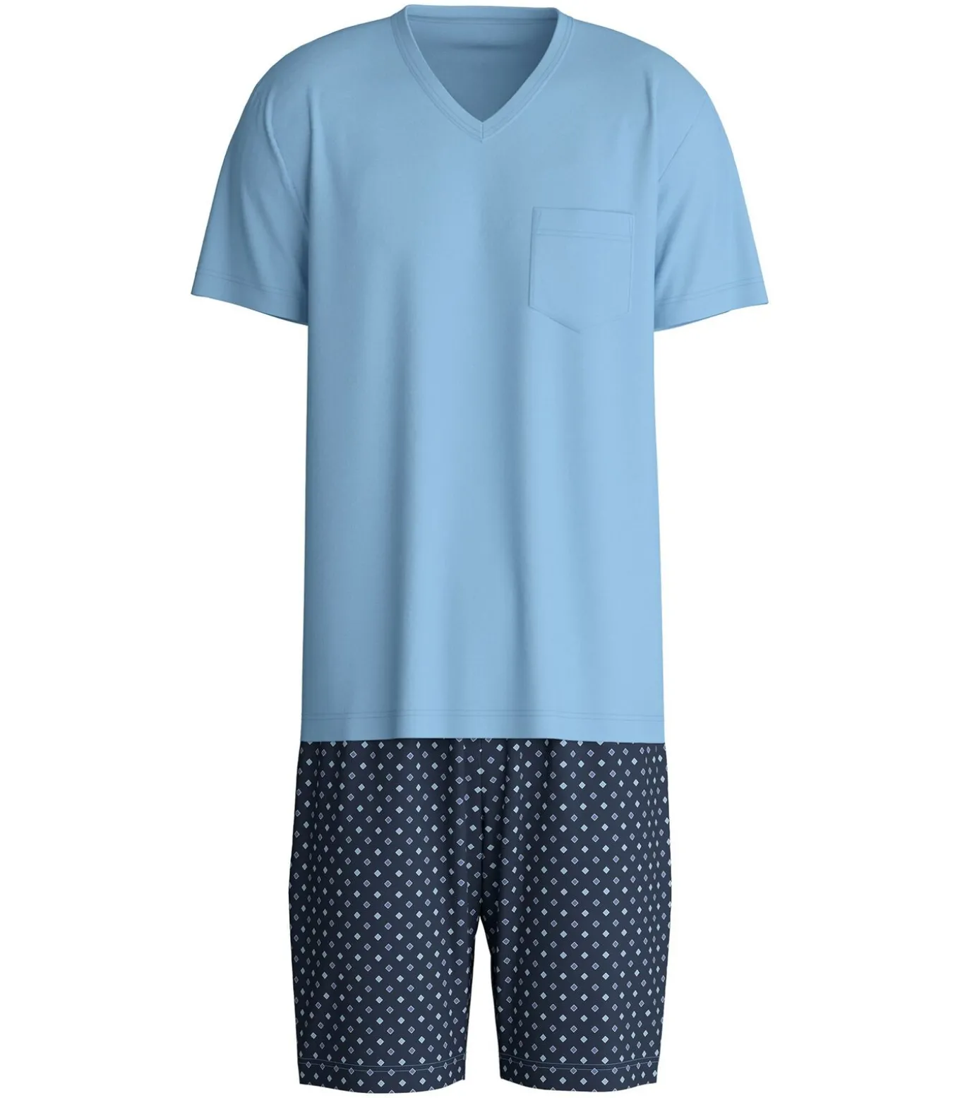 CALIDA pyjama voor heren. Korte pyjama set van aangenaam zacht katoen. T–shirt met V–hals en kleine borstzak. Korte broek met patroon.