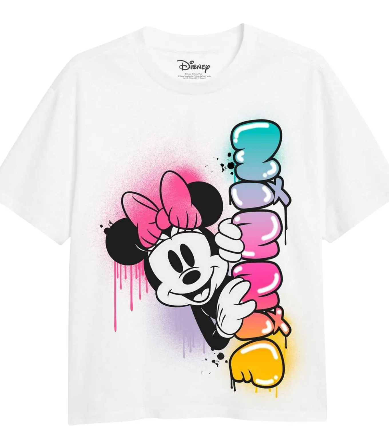 Disney–merkartikel: Regenboog Fade – T–shirt – Wit, gemaakt van 100% katoen. Het ontwerp bestaat uit vervagen, graffiti en een regenboog met tekst. Op de T–shirt is Minnie Mouse afgebeeld. De hals is een crew neck en het mouwtype is kort. Dit artikel is 100% officieel gelicentieerd van Disney.
