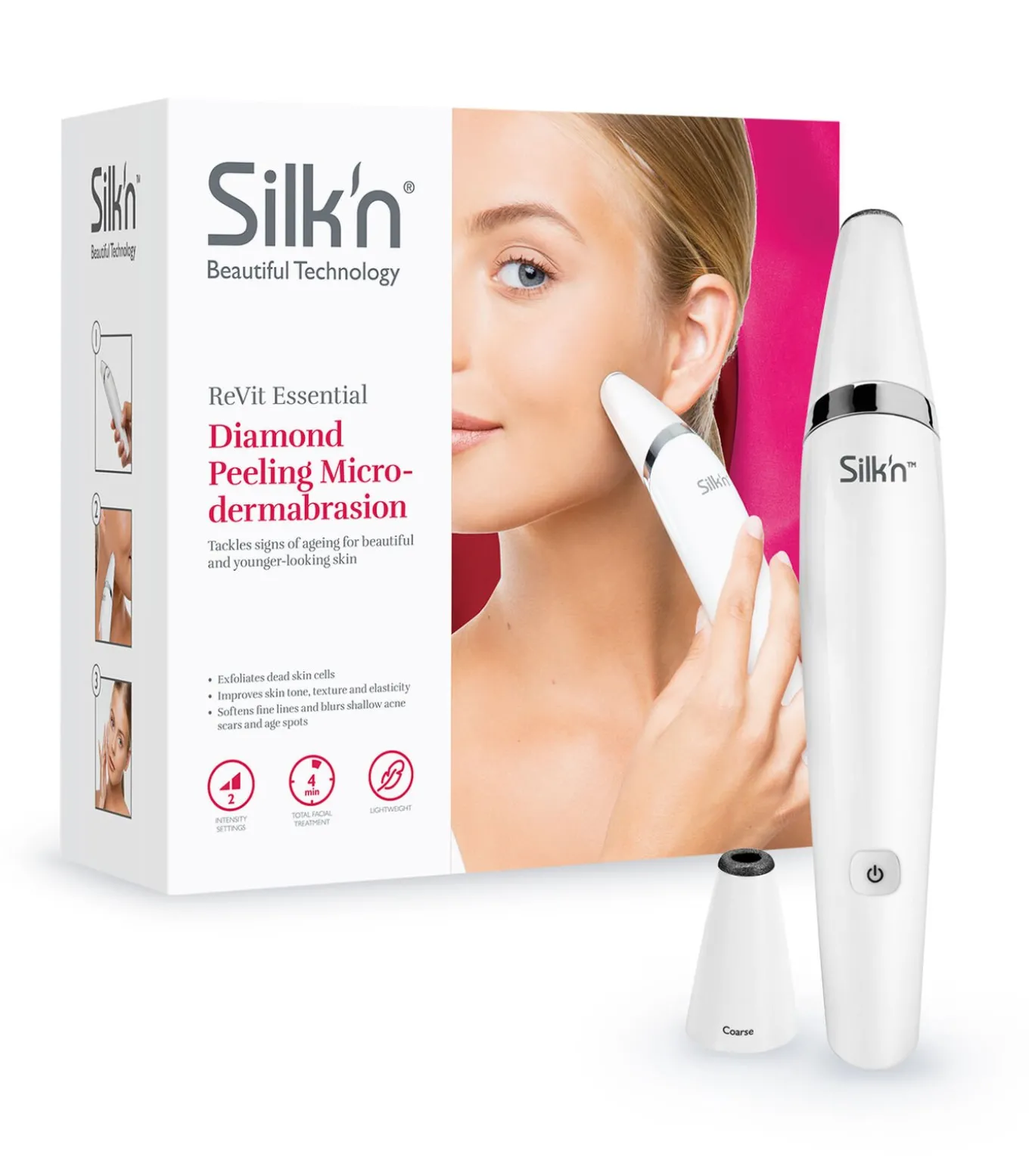 Silk’n ReVit Essential is een krachtig diamantpeeling microdermabrasie–apparaat dat in staat is om je in slechts enkele minuten een stevige, vitale en jonger uitziende huid te geven. Het apparaat voor huidverbetering doet dit door middel van twee technologieën, microdermabrasie exfoliatie en vacuüm stimulatie. Een peeling met dit apparaat is vergelijkbaar met een professionele peeling bij de schoonheidssalon.