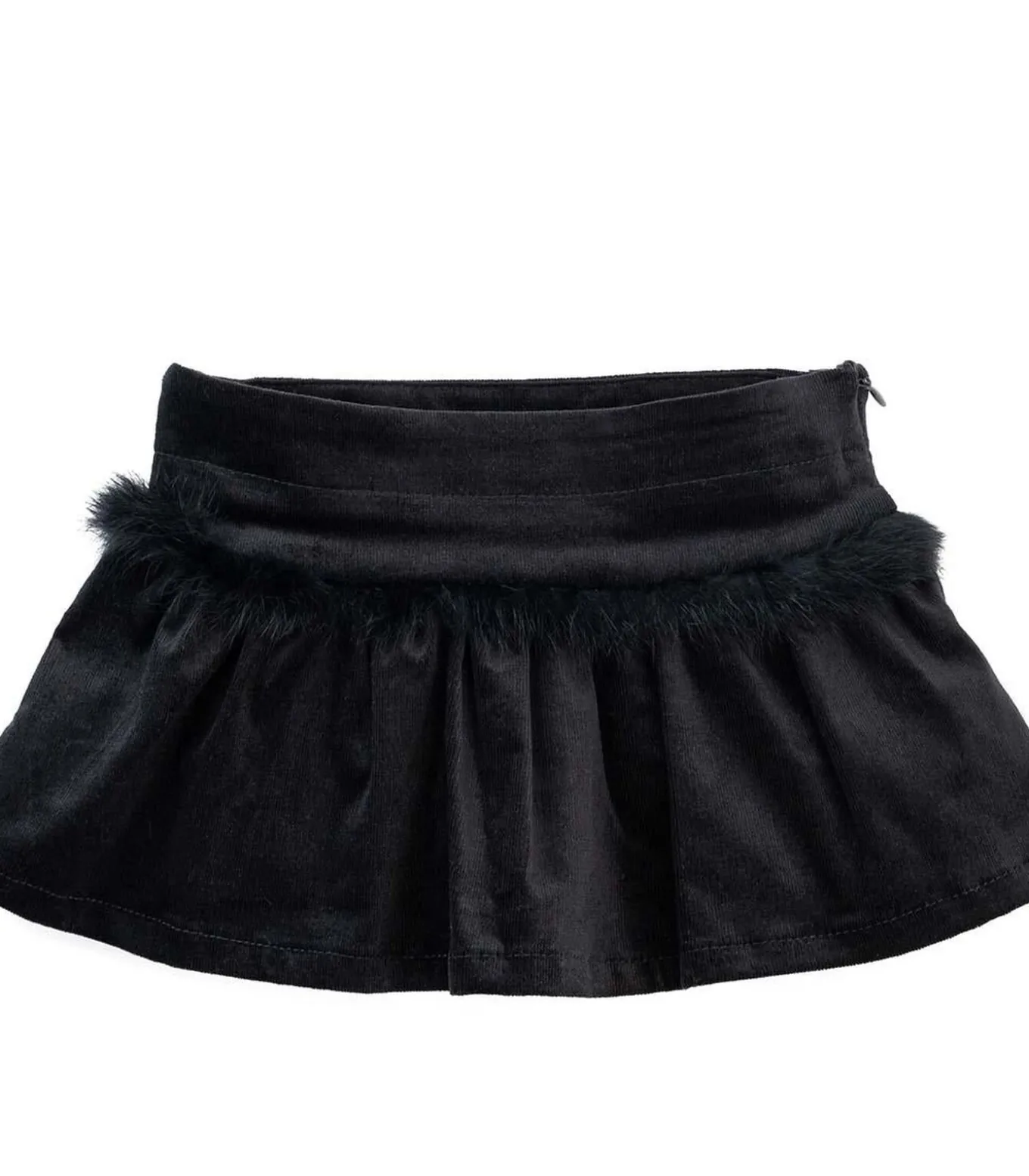 Zwart rokje in ribfluweel met verstelbare tailleband. Het rokje is afgewerkt met zwarte bont. Leuk te combineren met het witte t–shirtje met zwarte stippen.
