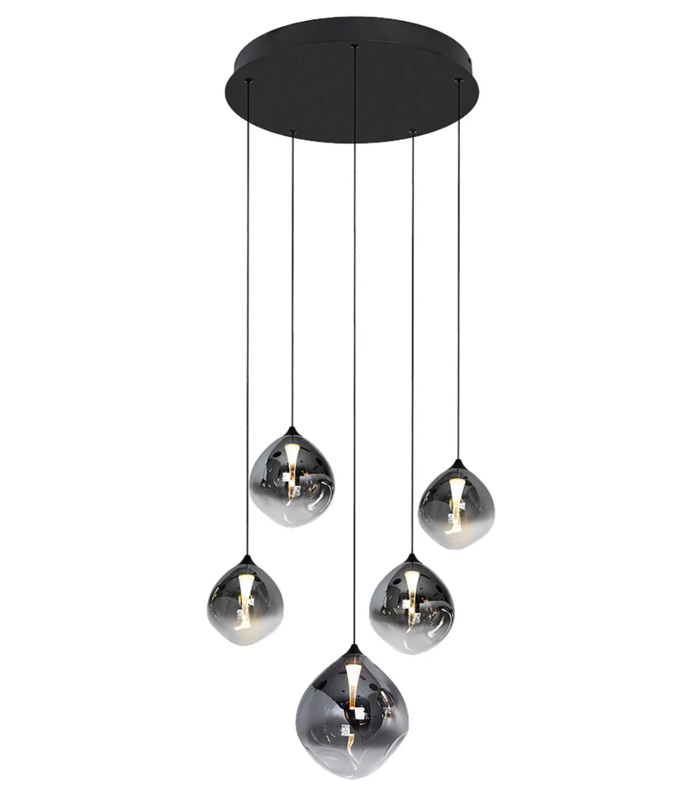 De Rosado hanglamp heeft een moderne, ronde zwarte plafondplaat en vijf pendels met lichtbronnen in organisch gevormd gerookt grijs glas. Deze unieke vormen geven de lamp een speelse, elegante uitstraling. Voorzien van geïntegreerde LED–verlichting met een warme kleurtemperatuur van 2700K, biedt de Rosado een sfeervol licht. De lamp is dimbaar met een dimbare schakelaar, zodat je de lichtsterkte gemakkelijk kunt aanpassen aan de gewenste ambiance.