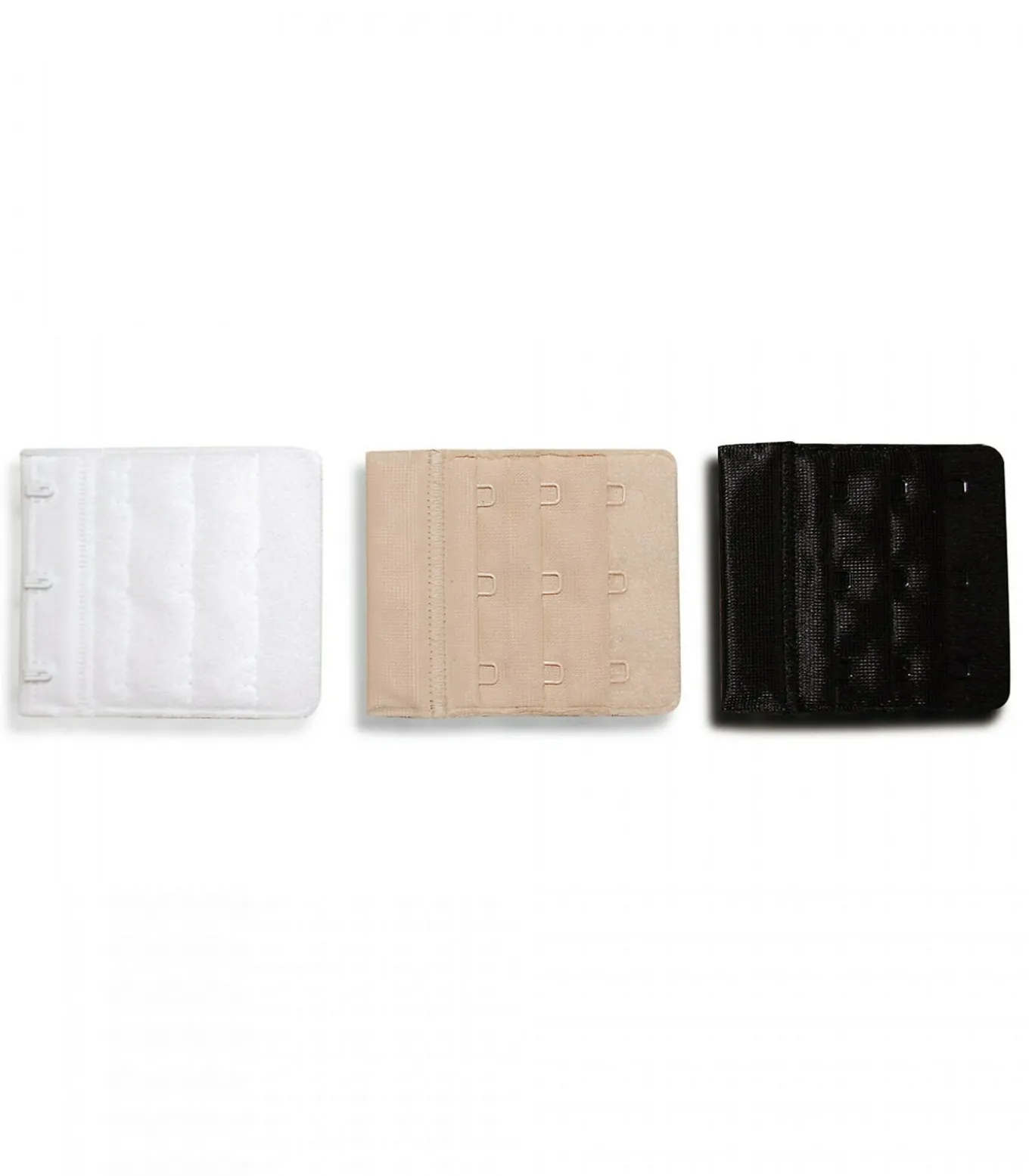 3 haakverlengingen van 57mm breed om achteraan enkele centimeters te winnen en perfect comfortabel in je bh te zitten. Elke set bevat één zwarte, één witte en één huiduitbreider.
