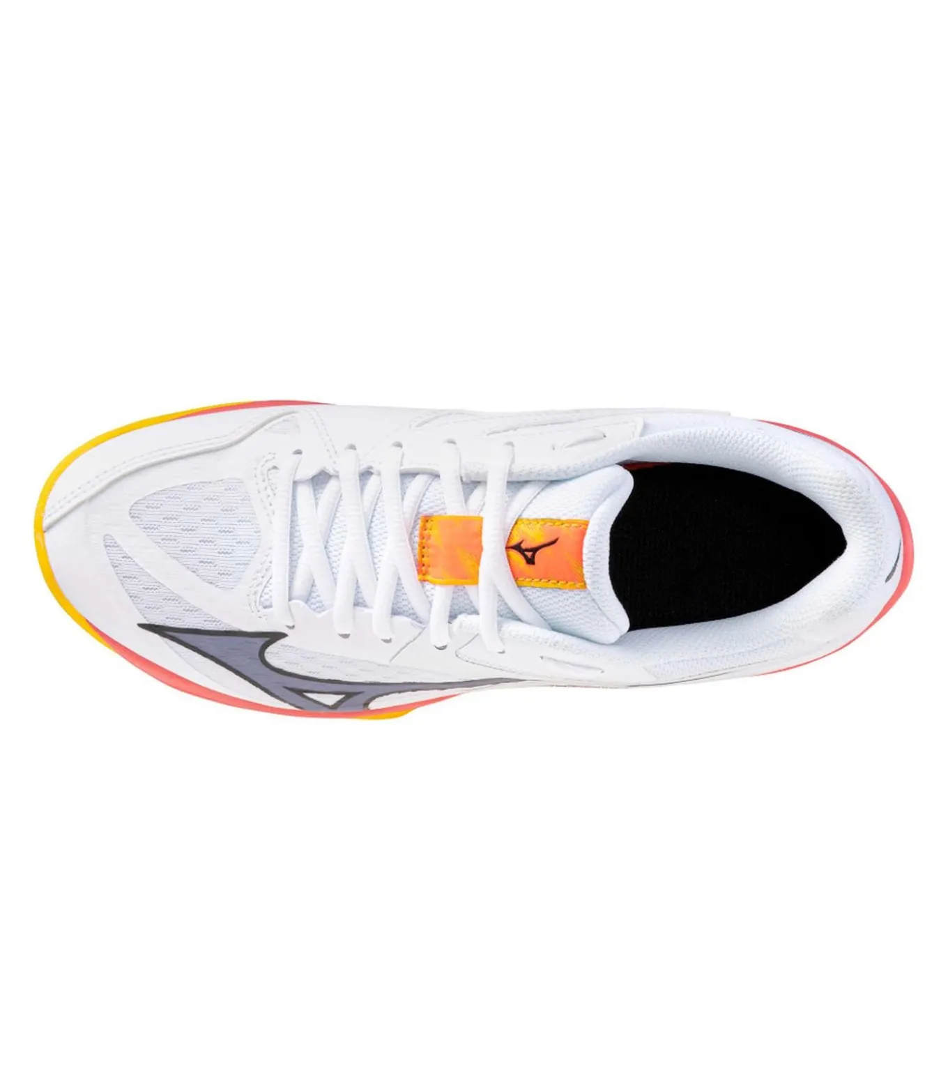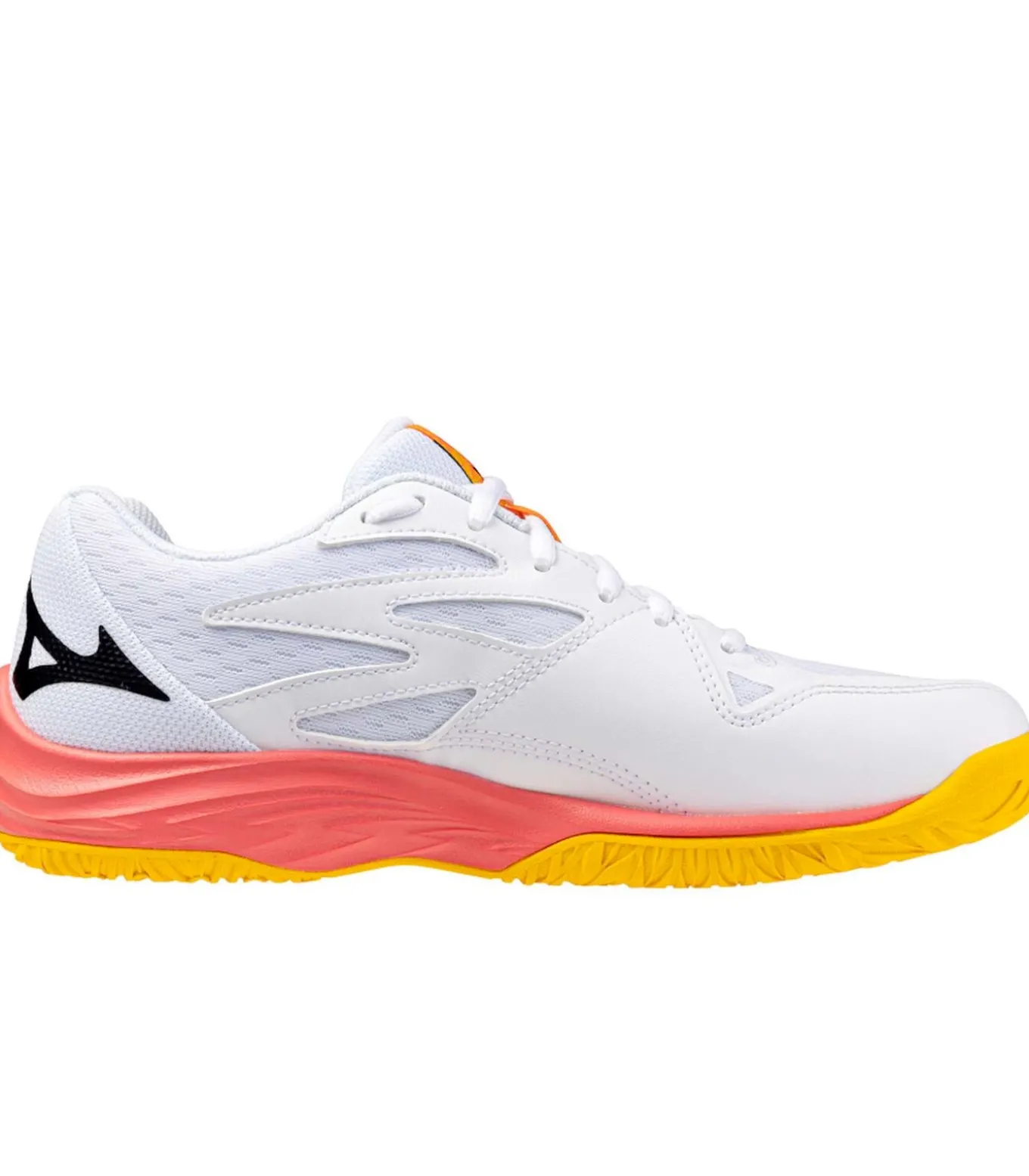 Kleur: Wit/Fiery Coral 2/Citrus Bovenwerk: Lichtgewicht, stressvrije constructie voor comfort en wendbaarheid Buitenzool: Rubber dat geen strepen achterlaat met een brede voorvoetuitlegger en TPU–stabilisator Binnenzool: Uitneembaar 5 mm met U4icX–stroboscooppaneel Gewicht: 245 g Details: Lichtgewicht geïnjecteerde EVA–middenzool met een gebeeldhouwd ontwerp, U4icX–technologie voor responsieve demping en extra comfort Gebruik: Junior volleybalschoenen ontworpen voor lichtgewicht stabiliteit en grip, ideaal voor jonge atleten die zaalwedstrijden spelen