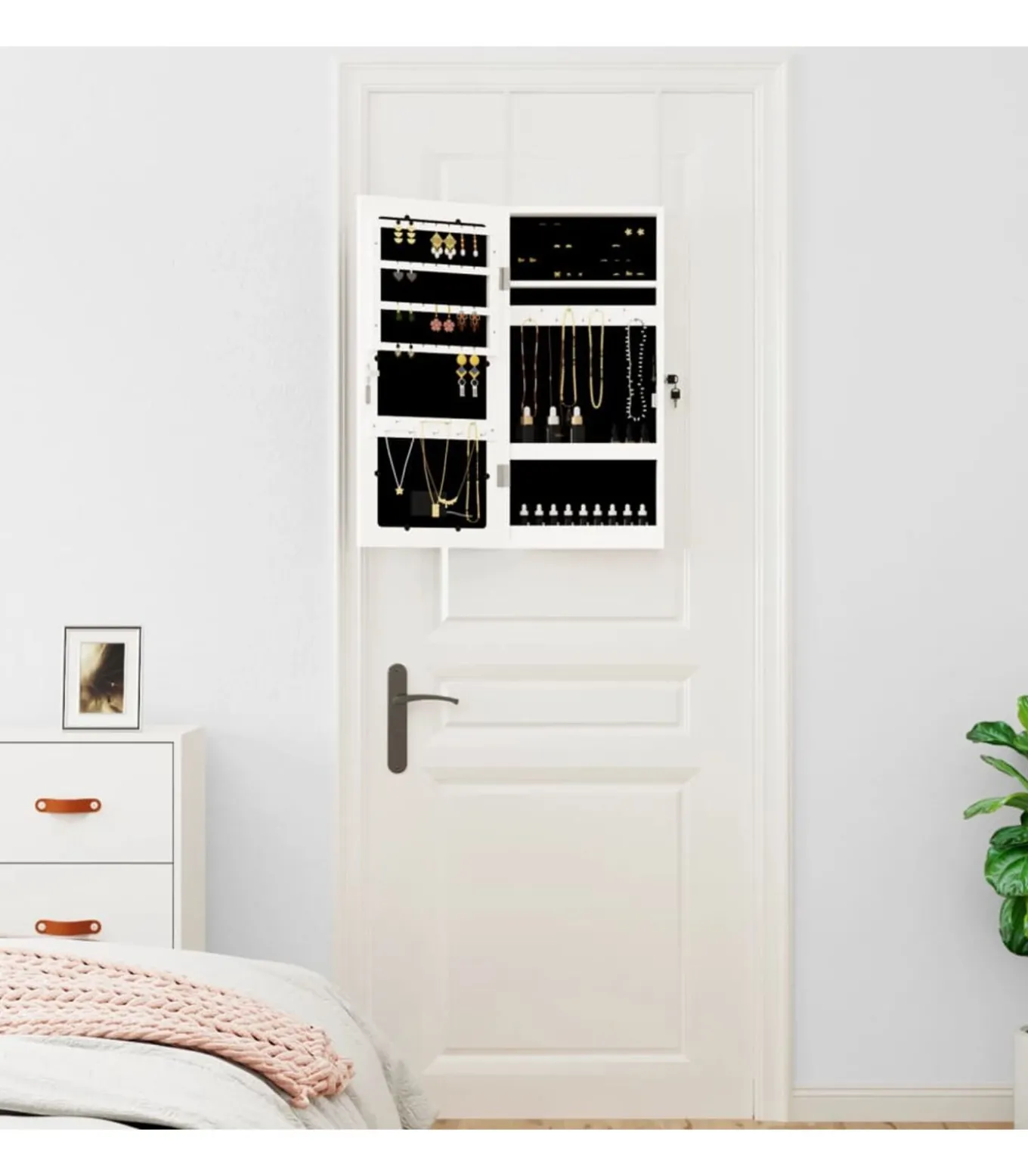 Voldoende opbergruimte: de spiegel met opbergruimte heeft veel haakjes, hangers en plankjes om je sieraden netjes geordend en binnen handbereik te houden.