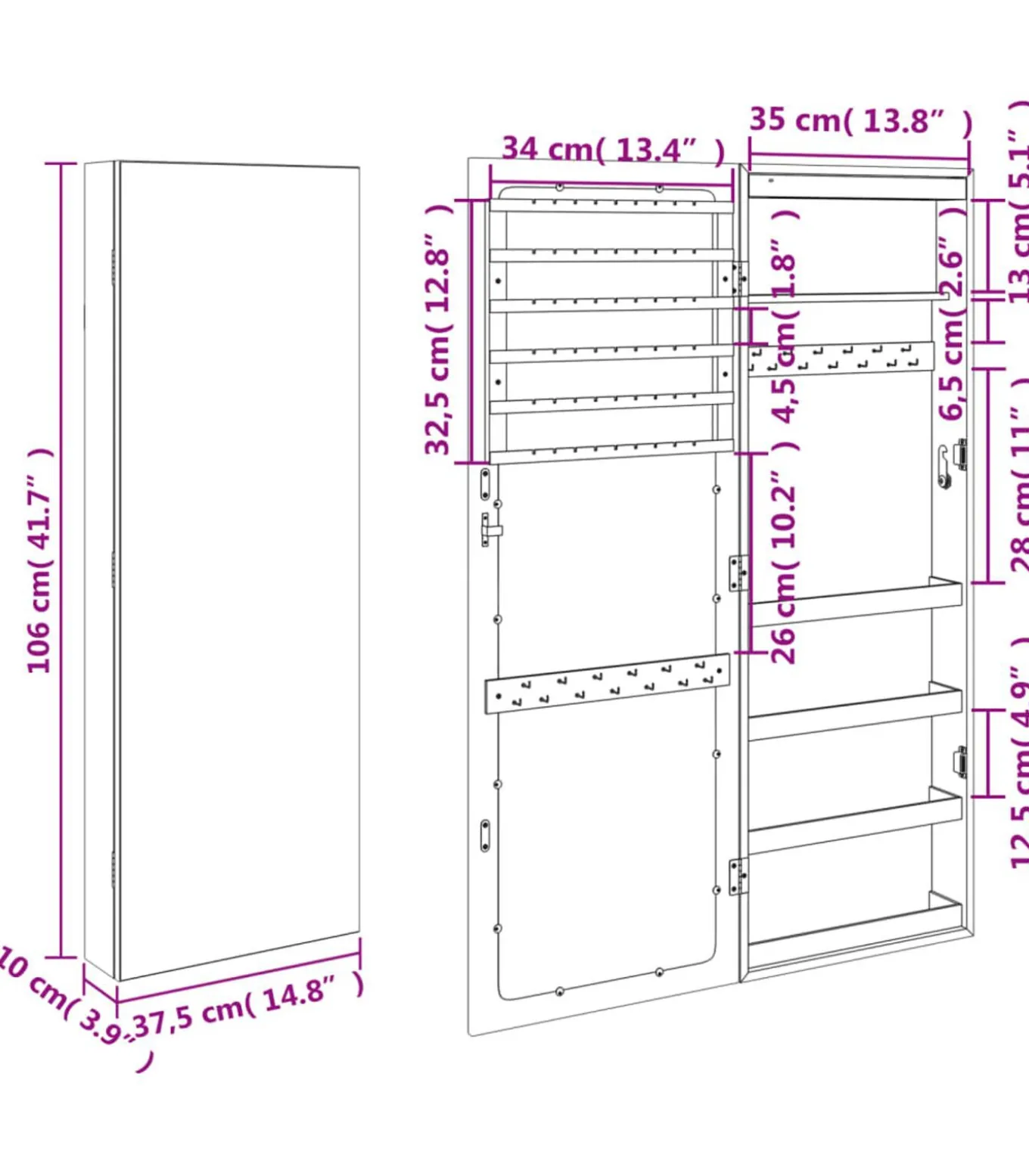 Voldoende opbergruimte: de spiegel met opbergruimte heeft veel haakjes, hangers en plankjes om je sieraden netjes geordend en binnen handbereik te houden.