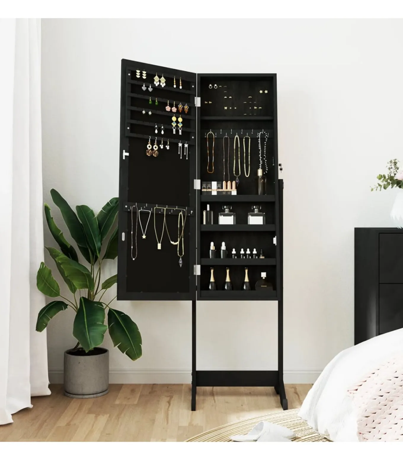 Voldoende opbergruimte: de spiegel met opbergruimte heeft veel haakjes, hangers en plankjes om je sieraden netjes geordend en binnen handbereik te houden.