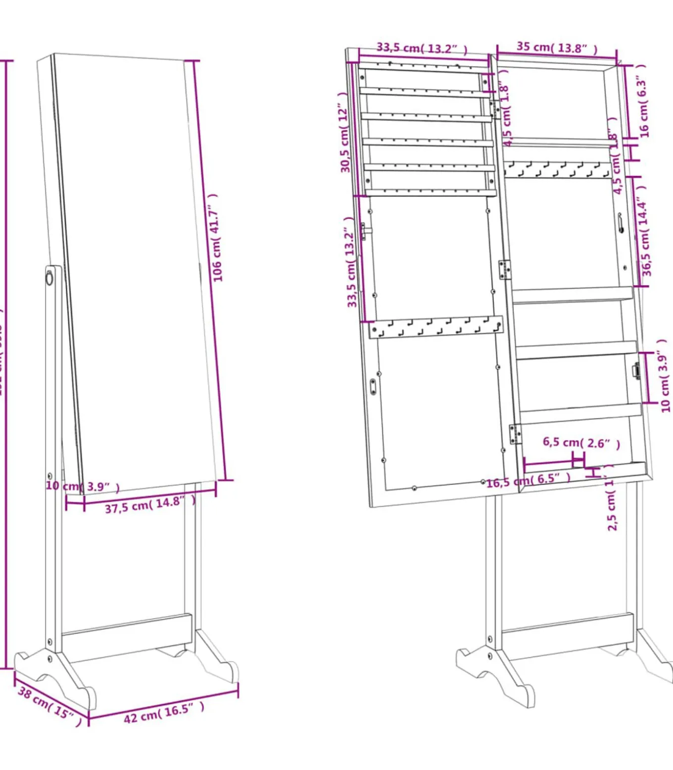 Afmetingen spiegel: 37,5 x 10 x 106 cm (B x D x H)