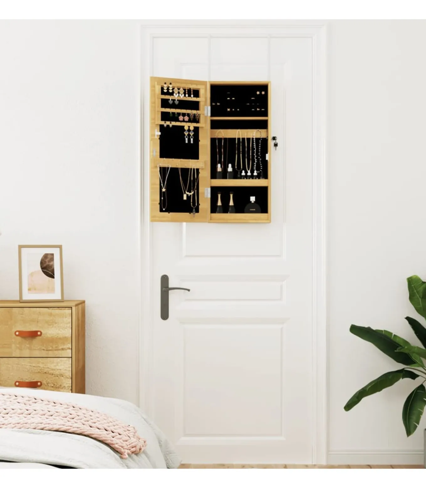 Voldoende opbergruimte: de spiegel met opbergruimte heeft veel haakjes, hangers en plankjes om je sieraden netjes geordend en binnen handbereik te houden.