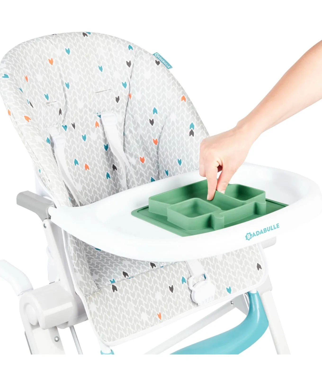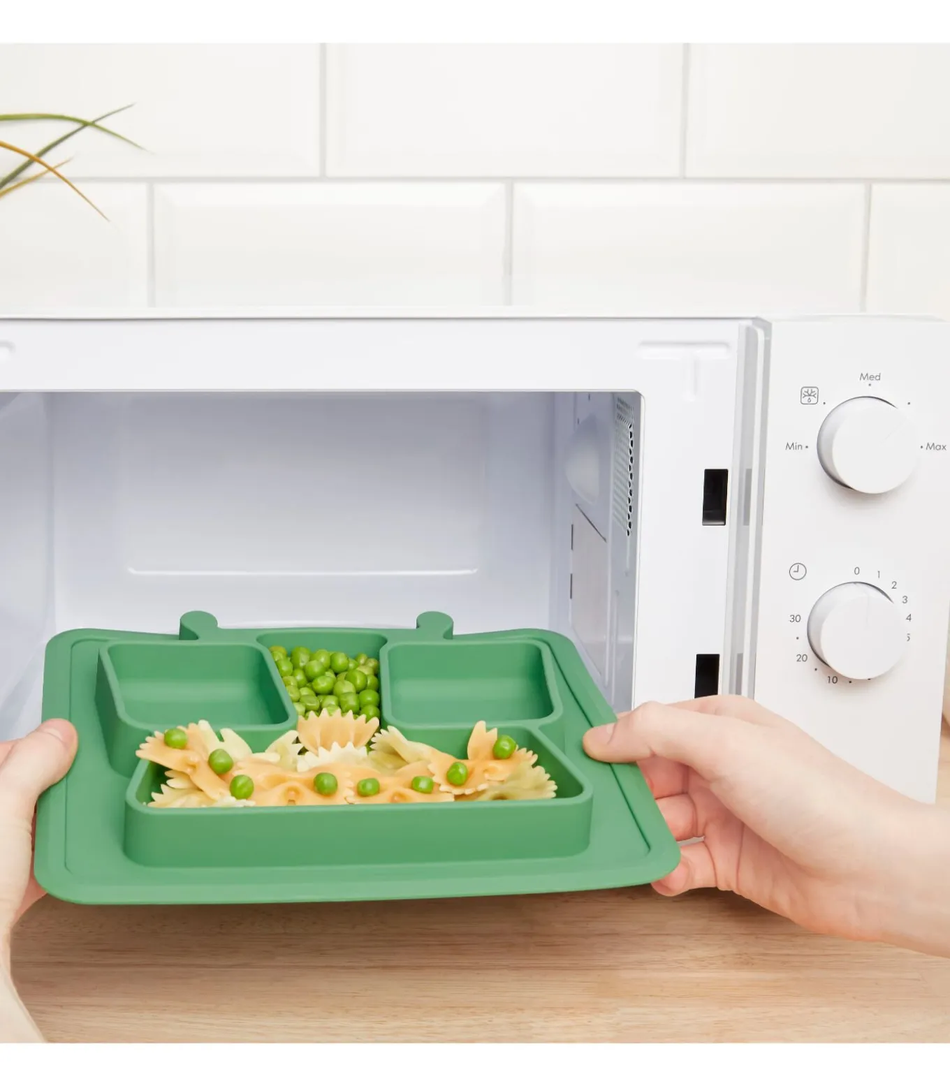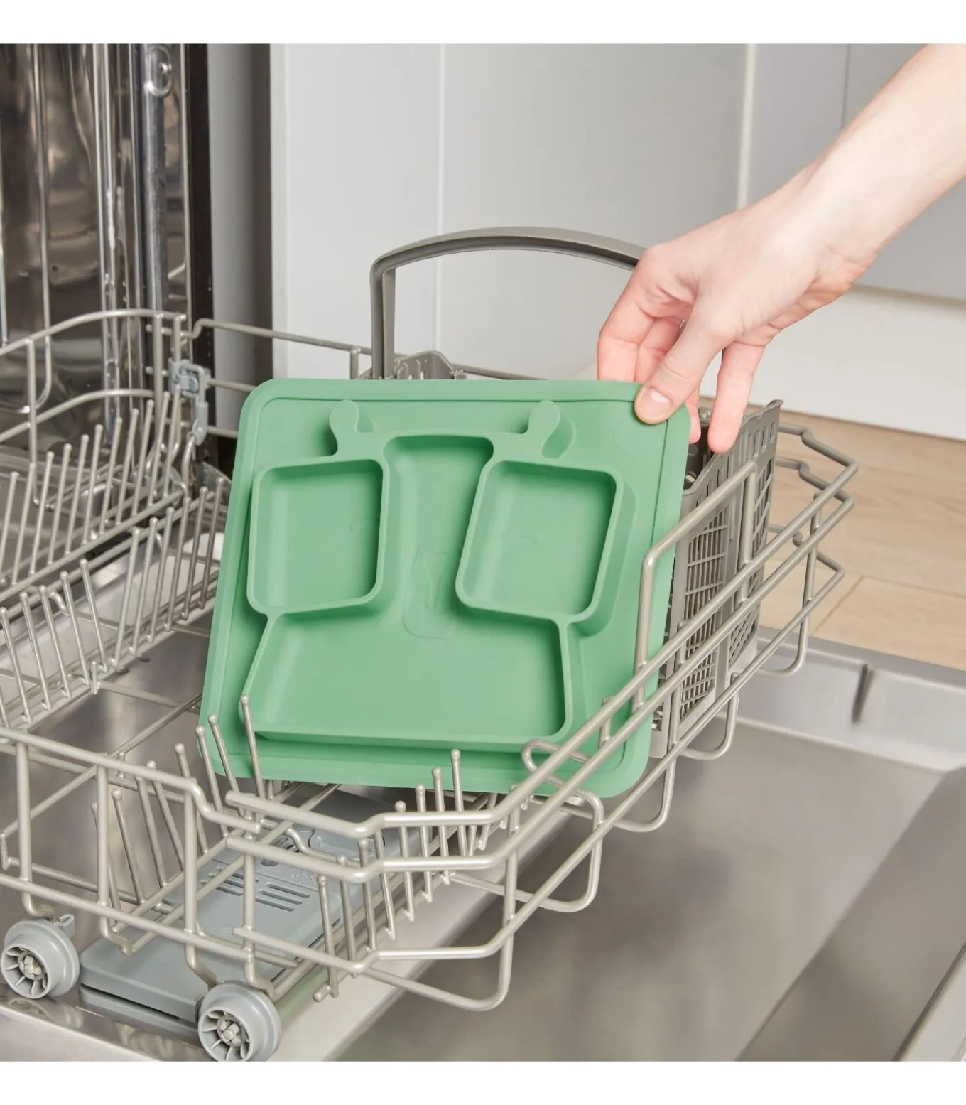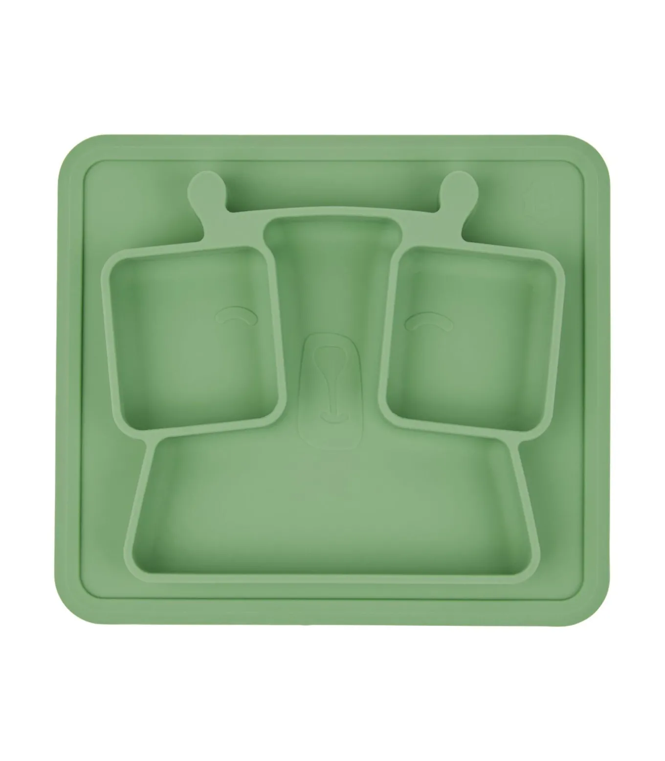3 vakken voor kindvriendelijke porties Gebogen randen om peuters te helpen voedsel te grijpen Zachte, antislip, vlekbestendige en onbreekbare siliconen plaat Ideale maat voor hoge stoelbladen Vriezer, magnetron en vaatwasmachinebestendig