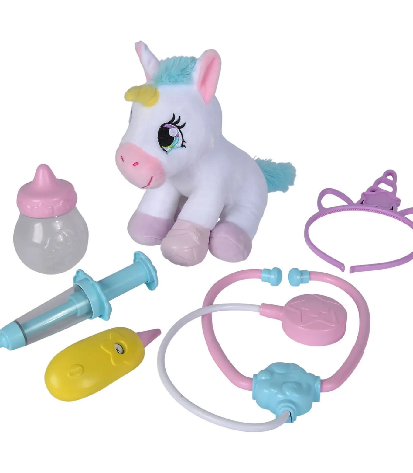 Simba dierenarts speelset eenhoorn knuffel – fantasie speelgoedsetMet deze dierenarts speelset van Simba beleef je magische avonturen samen met de schattige eenhoorn knuffel! Fantasie en zorgzaamheid komen samen wanneer je de eenhoorn verzorgt met de bijgeleverde doktersaccessoires. Luister naar zijn hartje met de stethoscoop, geef hem een flesje of meet zijn temperatuur – alles kan in jouw eigen dierenkliniek!De vrolijke eenhoorn met blauwe staart is heerlijk zacht en past perfect in de handige koffer. Zo neem je je patiënt overal mee naartoe. Deze speelset stimuleert creativiteit, rollenspel en empathie, en is ideaal voor kleine dierenliefhebbers en dromers vanaf 3 jaar. Laat je verbeelding de vrije loop en maak van elke dag een magisch avontuur!Extra informatieInclusief zachte eenhoorn knuffel en dokterskofferStimuleert creativiteit en rollenspelHandige koffer om alles in op te bergen en mee te nemenGeschikt voor kinderen vanaf 3 jaar