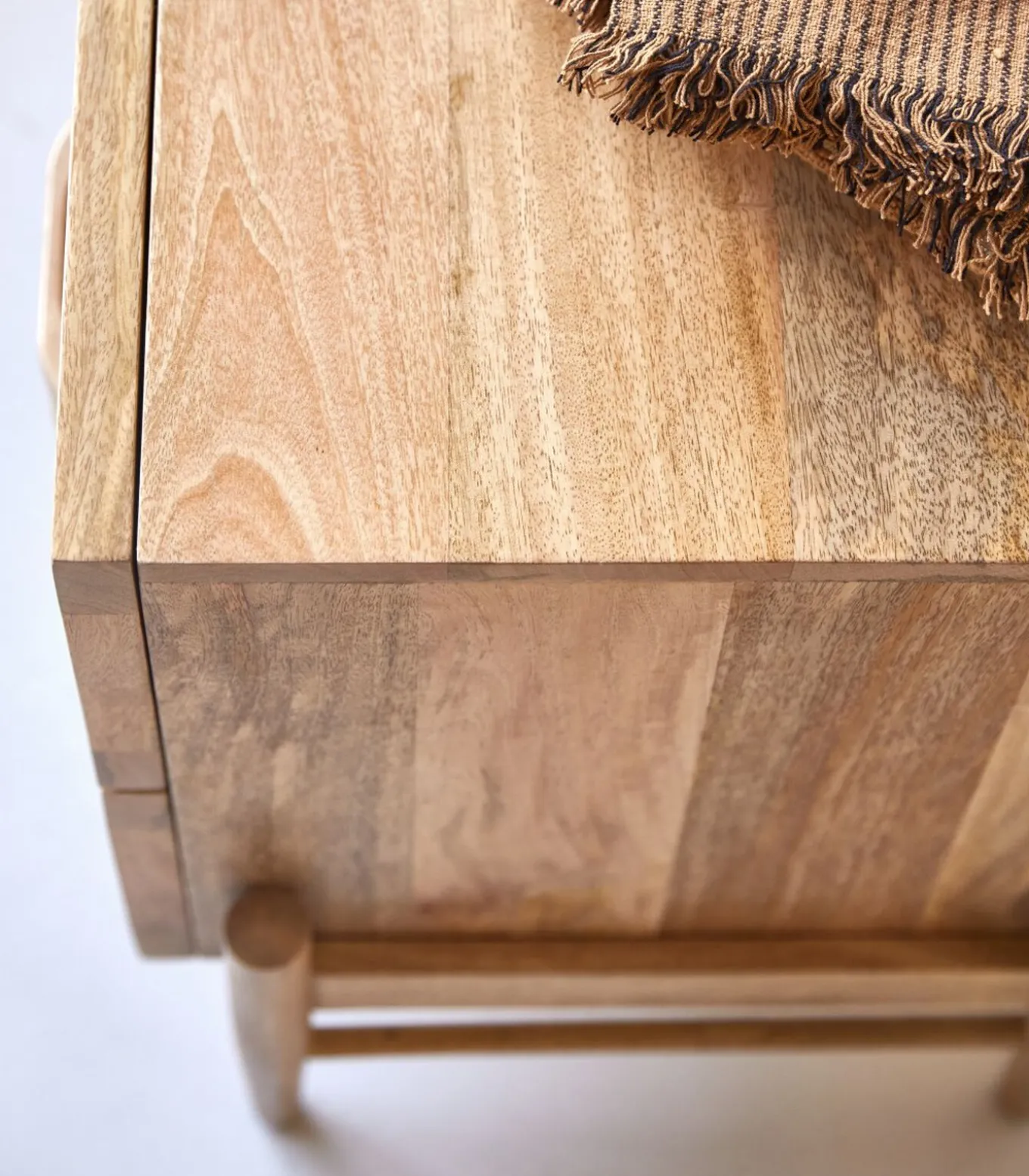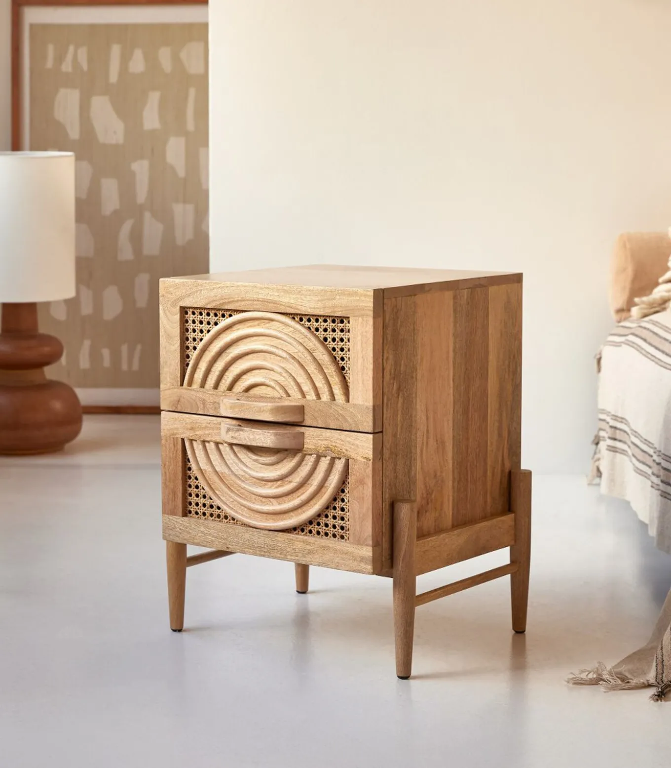 Het nachtkastje Sina van massief mangohout en rotan is gelakt voor veel dagelijks gebruiksgemak.