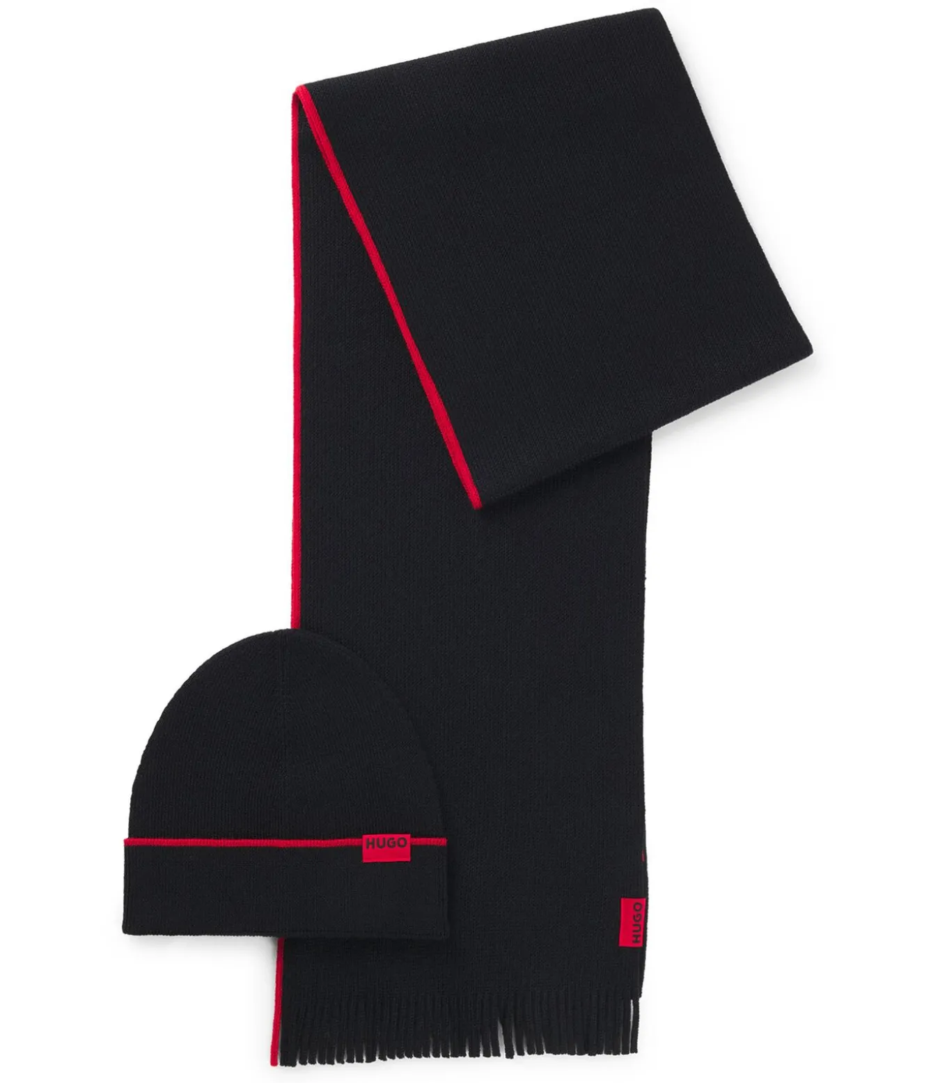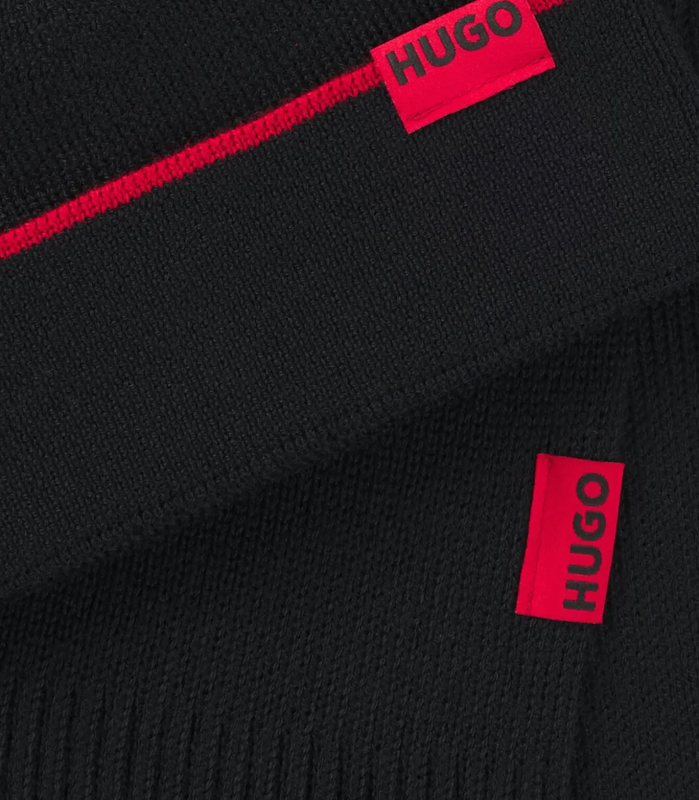 Gebreide sjaal en bijpassende muts in geschenkverpakking van HUGO. Aangenaam zachte scheerwollen mix. Met contrasterende strepen en logolabel. Lengte sjaal ca. 172 x 23 cm.
