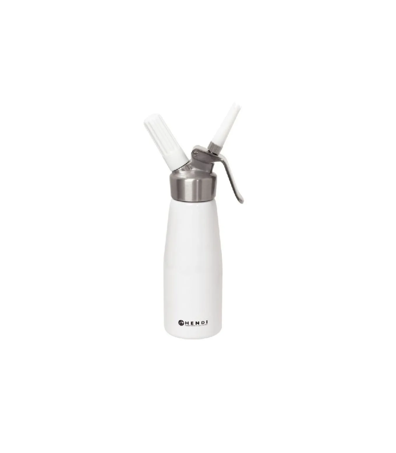 De Hendi slagroomspuit wit 0.5 liter is gemaakt van aluminium en heel makkelijk in gebruik. Hieronder de eigenschappen van de Hendi slagroomspuit wit: * 0.5 Liter * Aluminium * Wit * Drie spuitmondjes * Schoonmaakborsteltje * Met de hand wassen * Ook beschikbaar in 0.25 en 1 liter