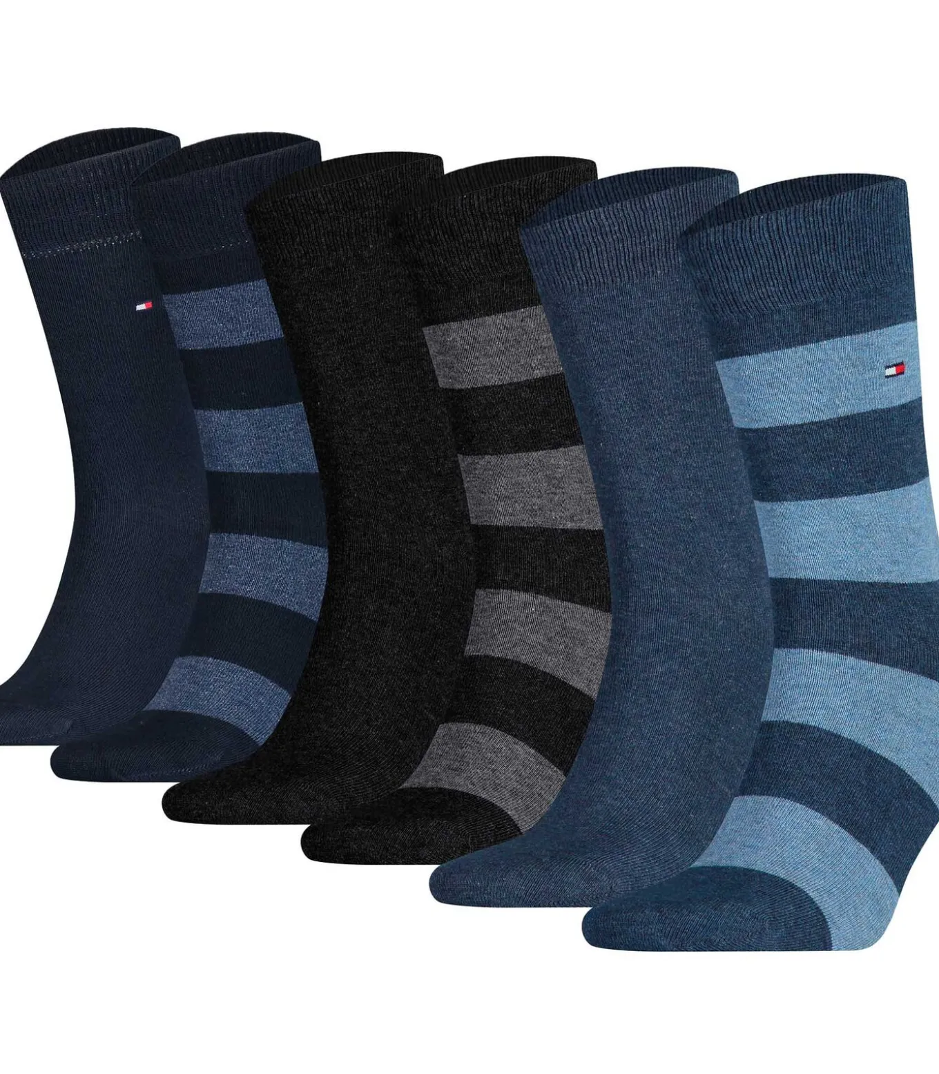 6 paar sokken in de kleuren zwart, marineblauw en jeansblauw waarvan 3 paar uni en 3 paar met strepen motief van Tommy Hilfiger in een voordeelpack