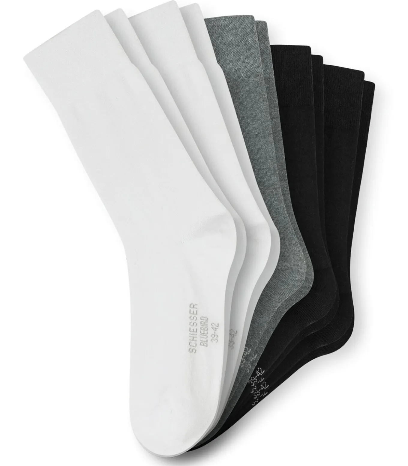 Vijf paar korte sokken voor heren van SCHIESSER. Met hoogwaardig fijn gekamd katoen, drukvrije boord, handgeknoopte tenen en hielen.