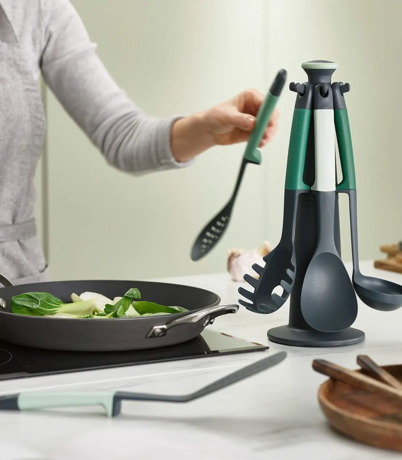 Al je kookgerei dicht bij de hand in een luxe, draaibare carrousel. De Joseph Joseph Carrousel Elevate bestaat uit zes onmisbare keukenhulpjes. De set bestaat uit een opscheplepel, spaghetti lepel, juslepel, bakspaan en vergietlepel. Het keukenbestek is zo ontworpen dat door een balanssysteem het werkdeel het keukenblad niet raakt. Bij het eten bereiden kunt u de lepel of spatel rustig neerleggen zonder dat het werkblad vies wordt. De keukenhulpjes van de Joseph Joseph Elevate carrousel zijn hittebestendig tot 240 °C en zijn vaatwasserbestendig.